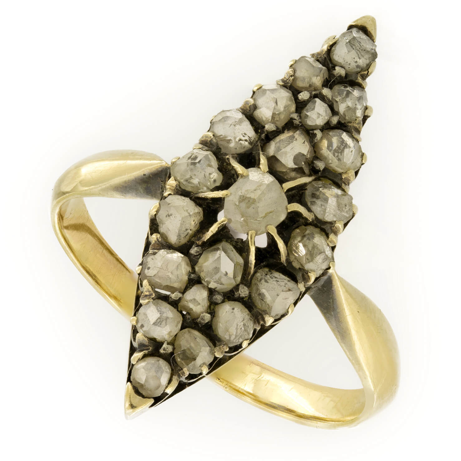 Anello antico forma marquise realizzato in oro giallo 18kt e diamanti rosecut 0,70ct tot. Misura 15