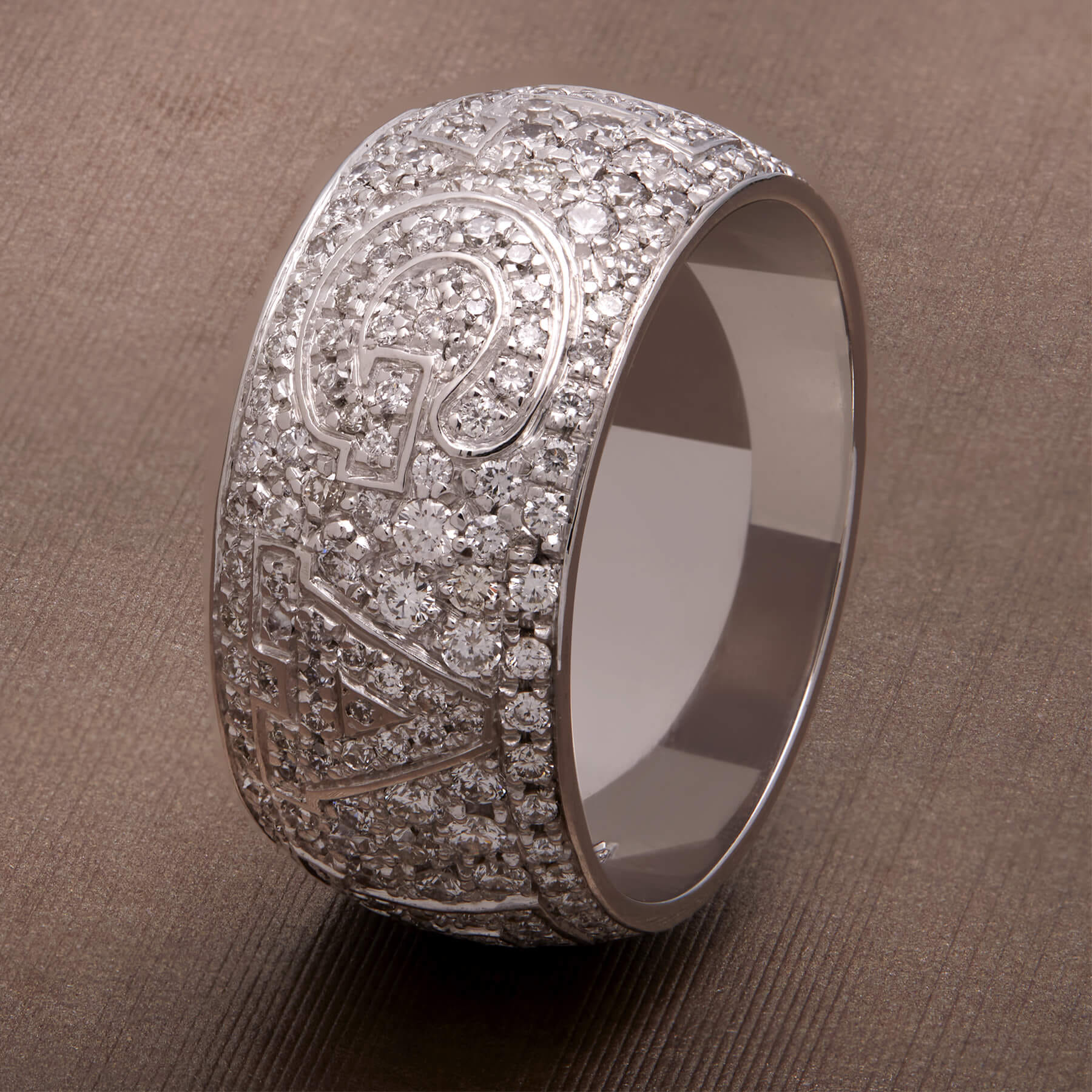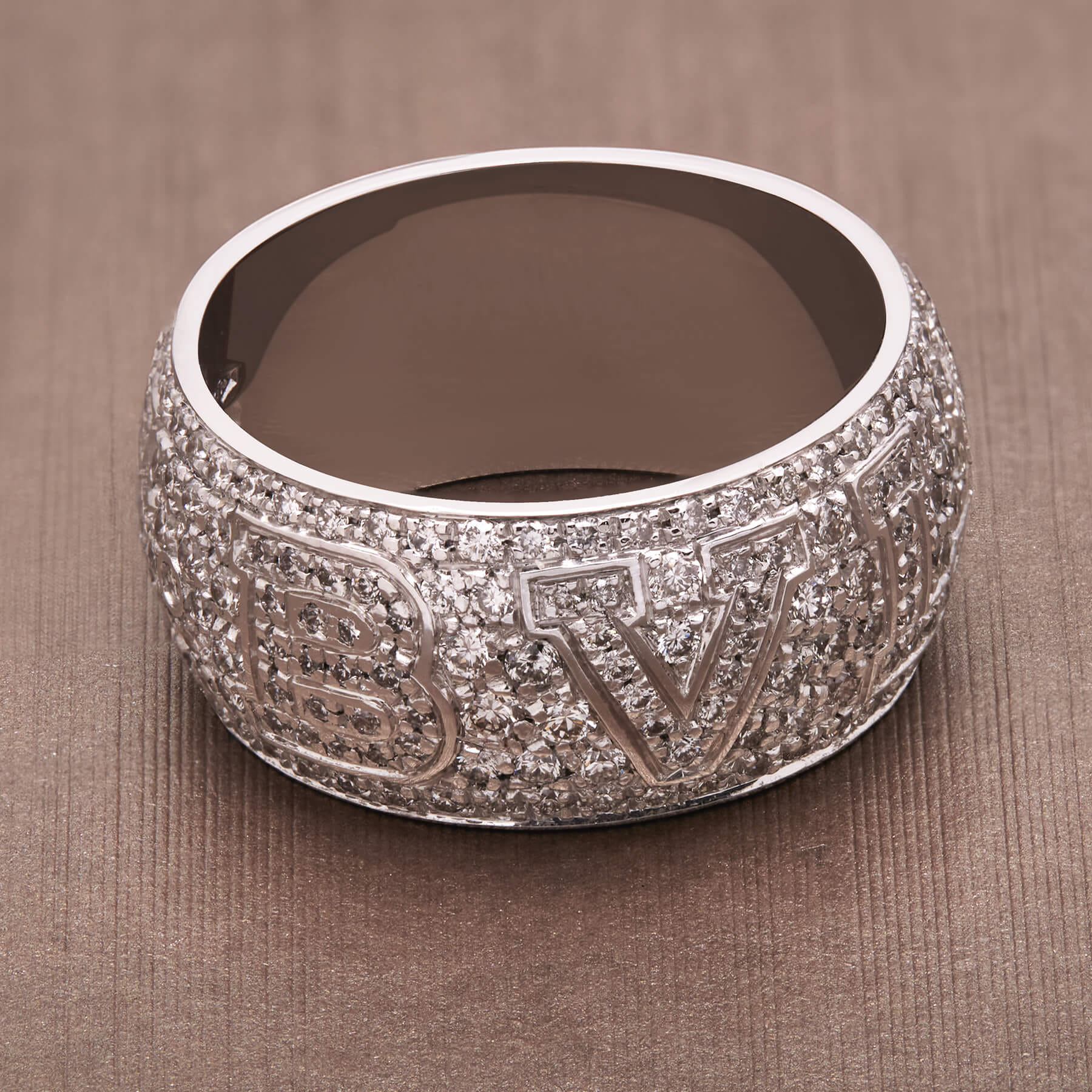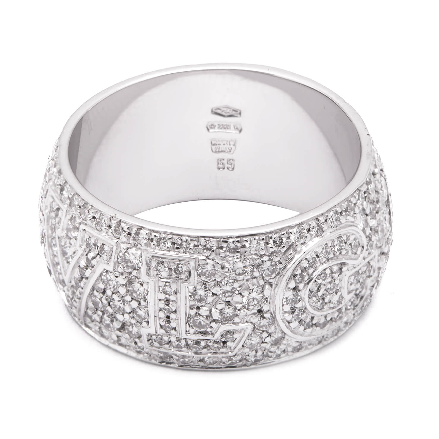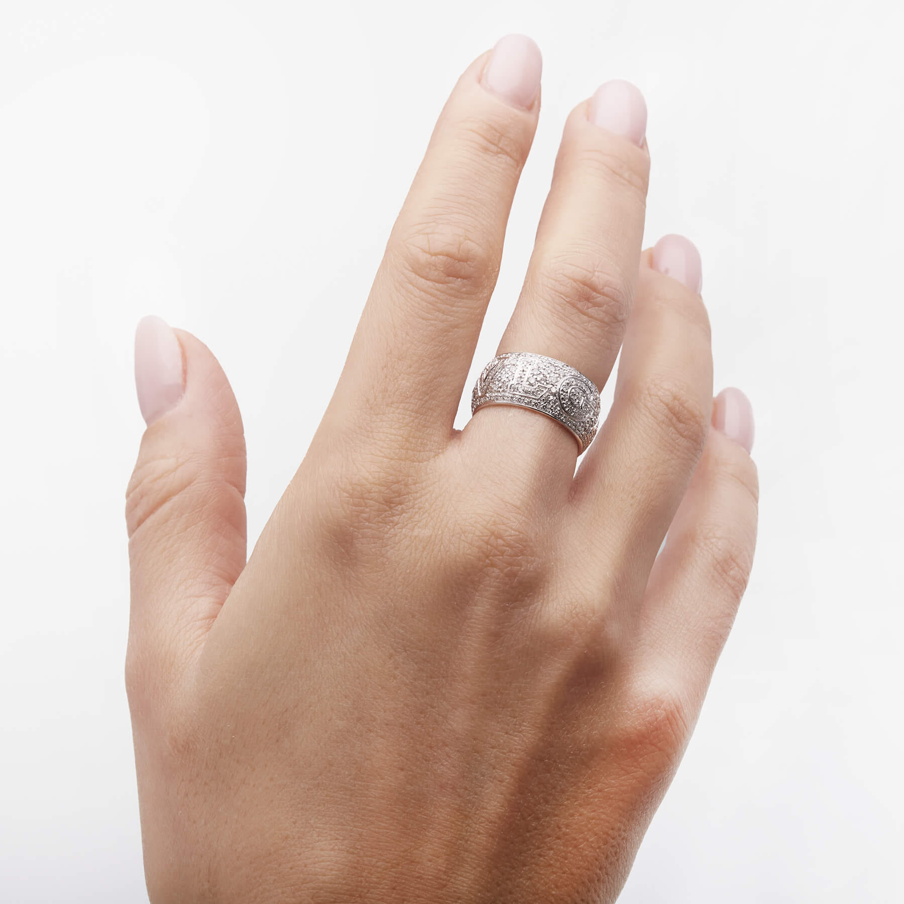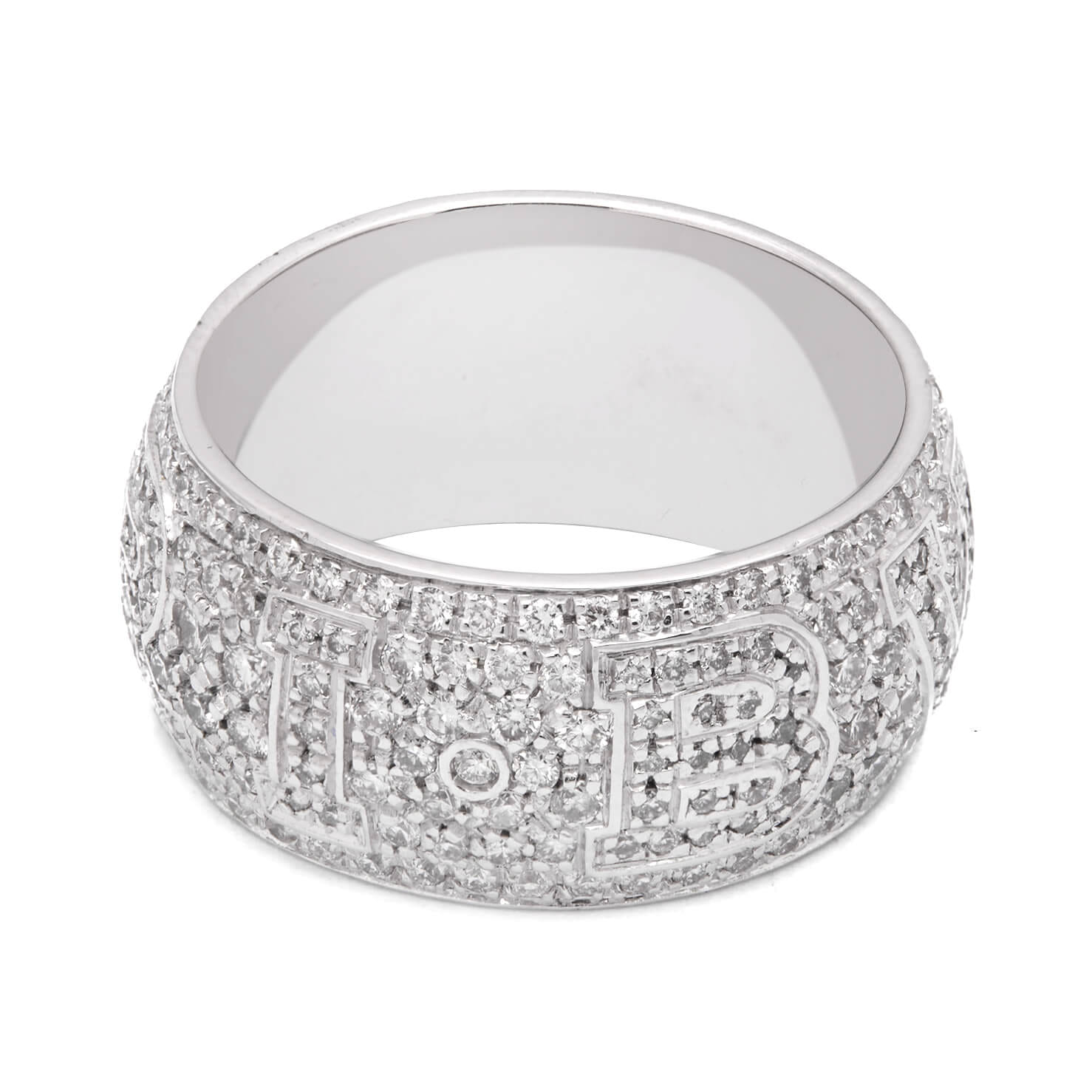 Anello fascia Bulgari monologo realizzato in oro bianco 18kt e diamanti round 2ct circa. Misura 13