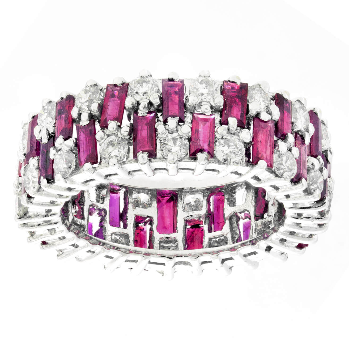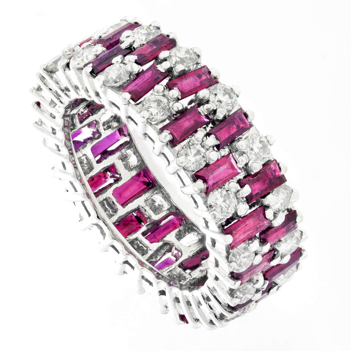 Anello fascia in oro bianco 18kt con diamanti taglio round 1,30ct e rubini taglio baguette 3ct tot. Misura 16
