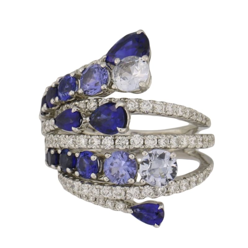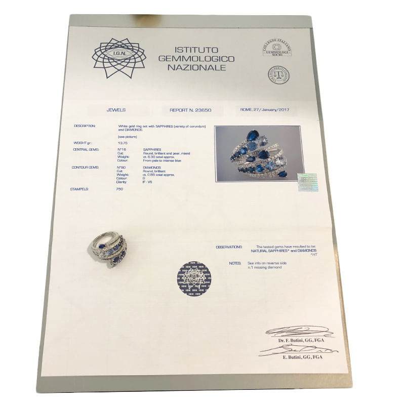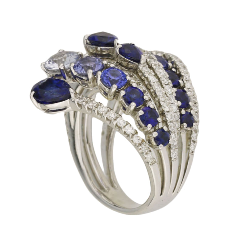 Anello in oro bianco 18kt con diamanti taglio rotondo brillante 0,85ct e zaffiri 6,30ct