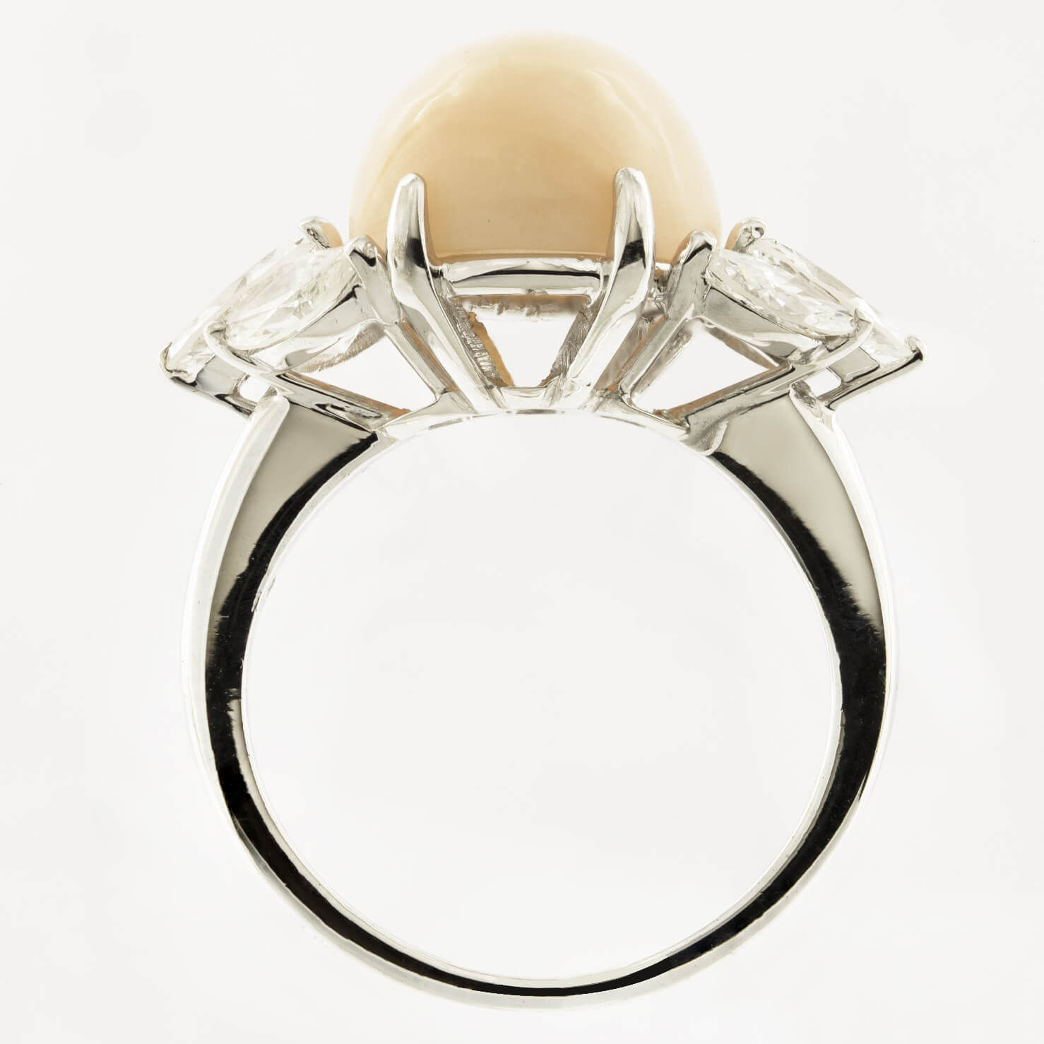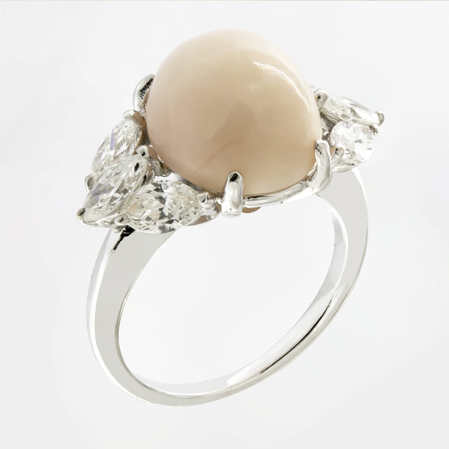 Anello realizzato in oro bianco 18kt con diamanti taglio marquise 1.50ct tot e corallo rosa taglio cabochon. Misura 10.5