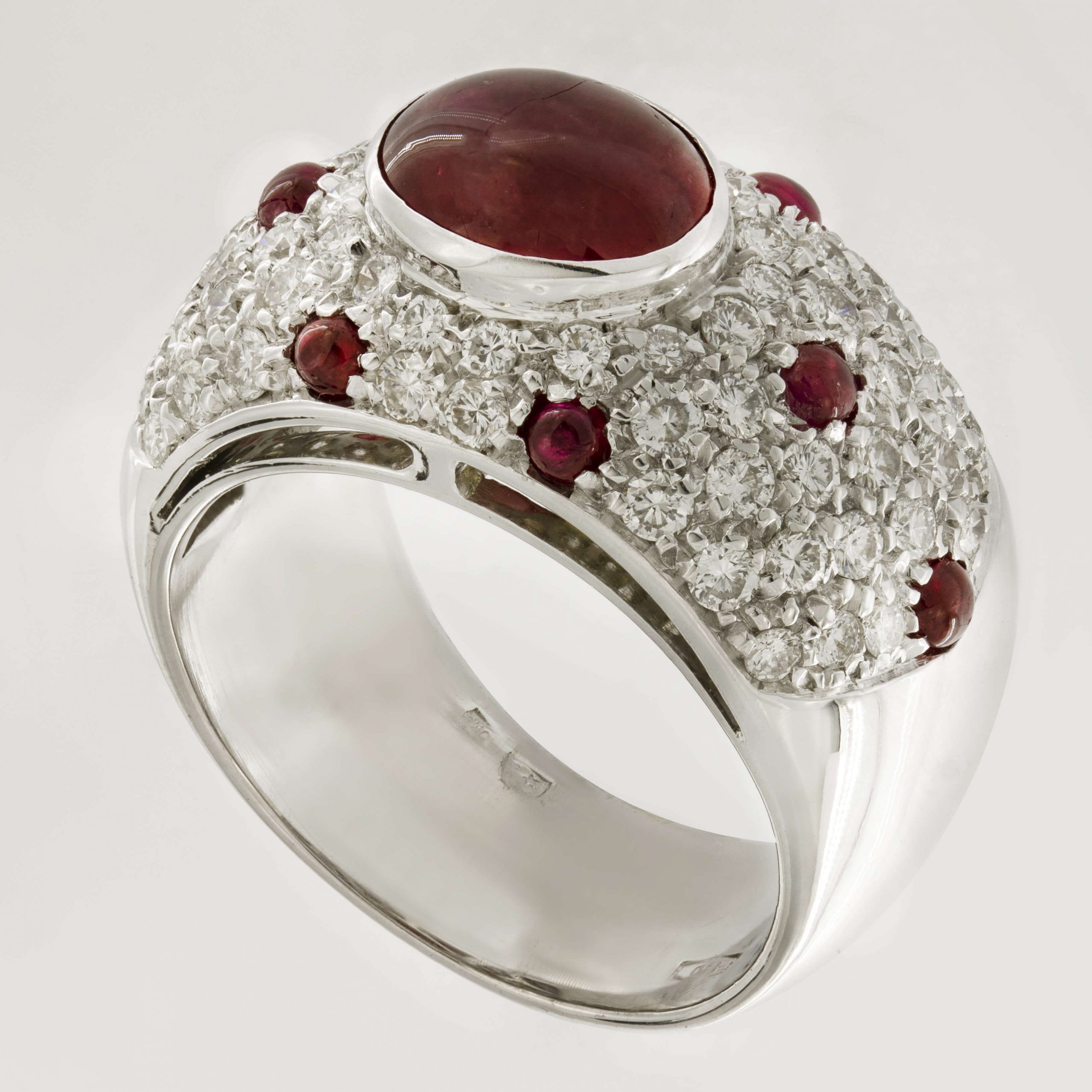 Anello in oro bianco con diamanti taglio round 1,36ct tot e rubini 0,56ct tot