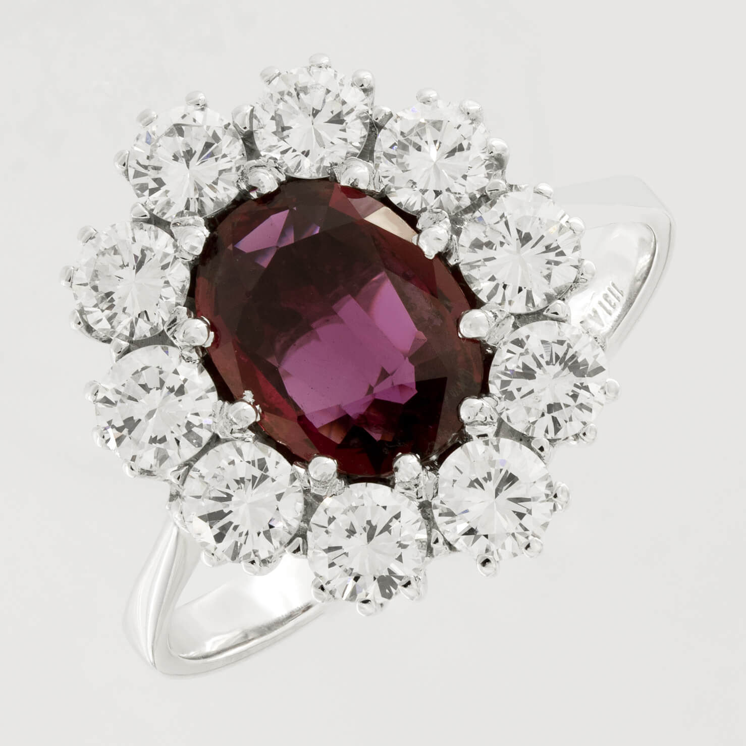 Anello in oro bianco con rubino siam 1,67ct e diamanti 1,50ct tot