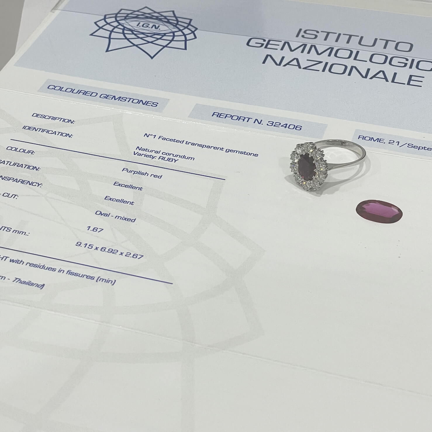 Anello realizzato in oro bianco 18kt con rubino 1,67ct e diamanti round 1,50ct tot. Misura 18. Con certificato IGN