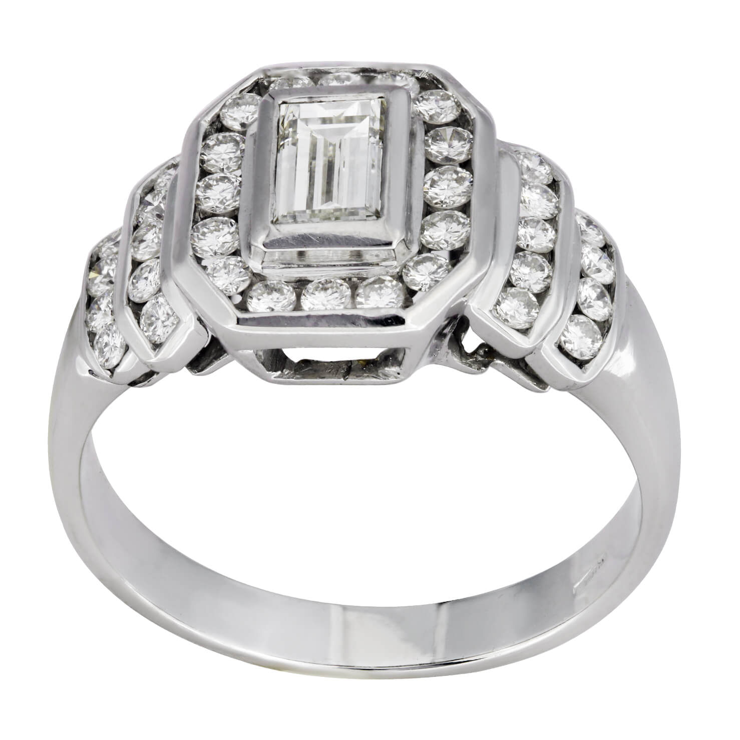 Anello realizzato in oro bianco 18kt con diamante emerald centrale 0,60 ct e diamanti taglio round 0,51 ct tot.