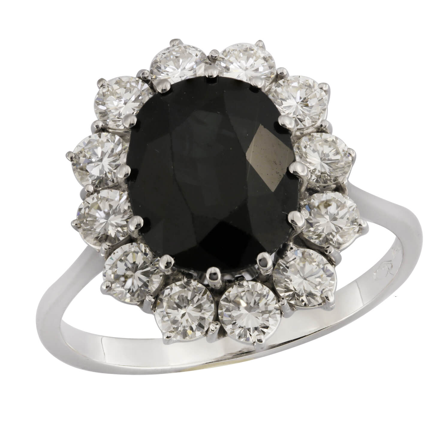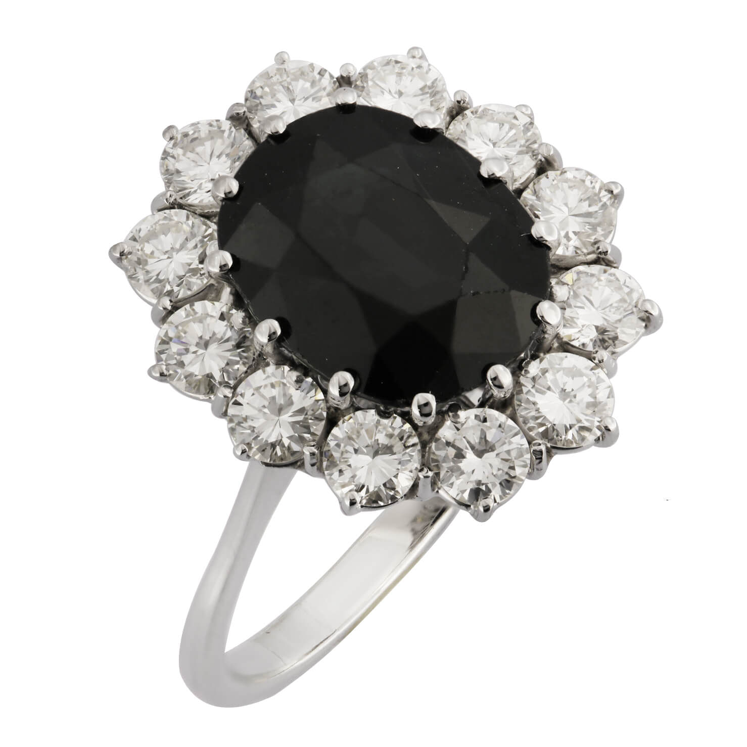 Anello realizzato in oro bianco 18kt con zaffiro centrale 5 ct e diamanti taglio round 1,20 ct tot.