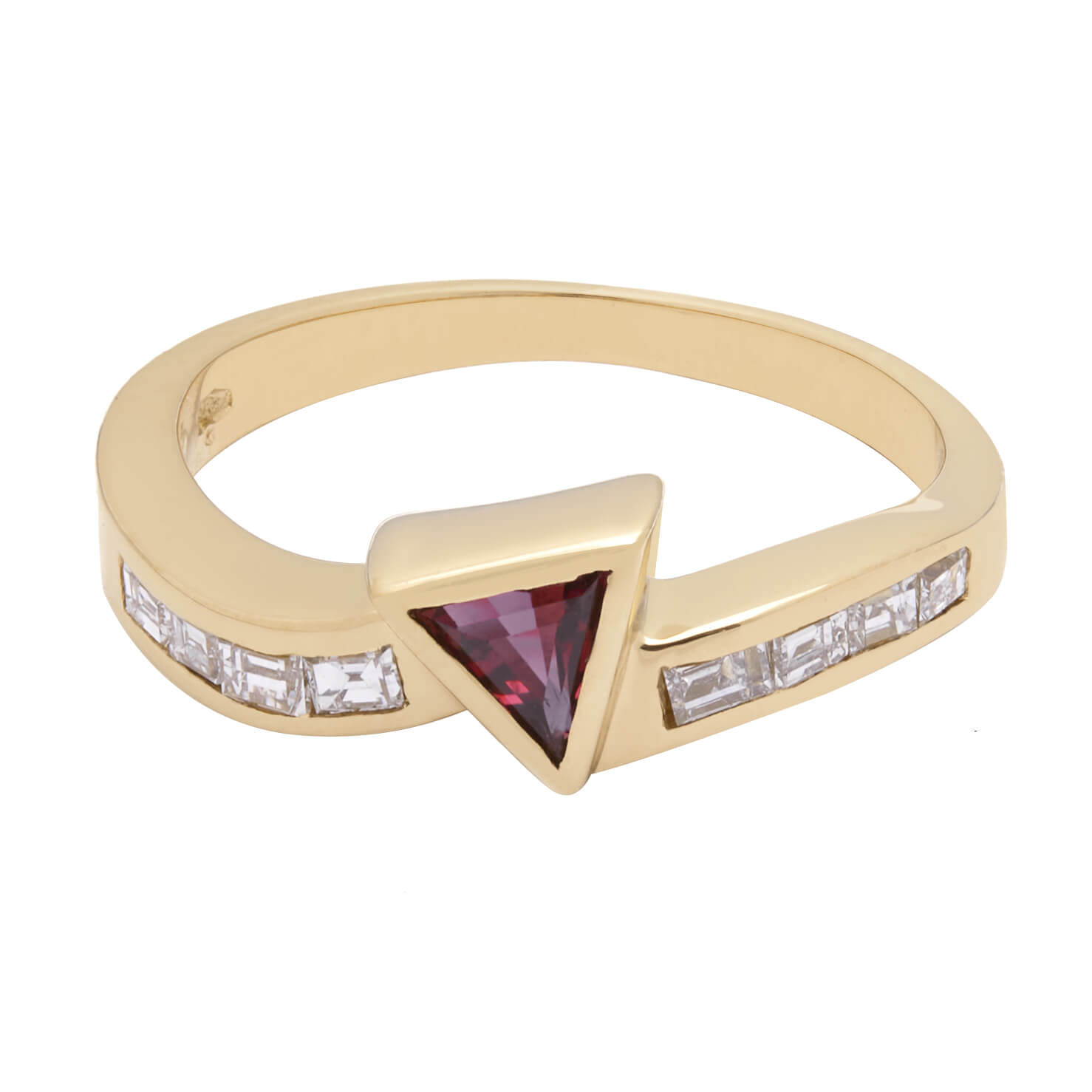 Anello in oro giallo con diamanti taglio baguette 0,32ct tot e rubino 0,50ct