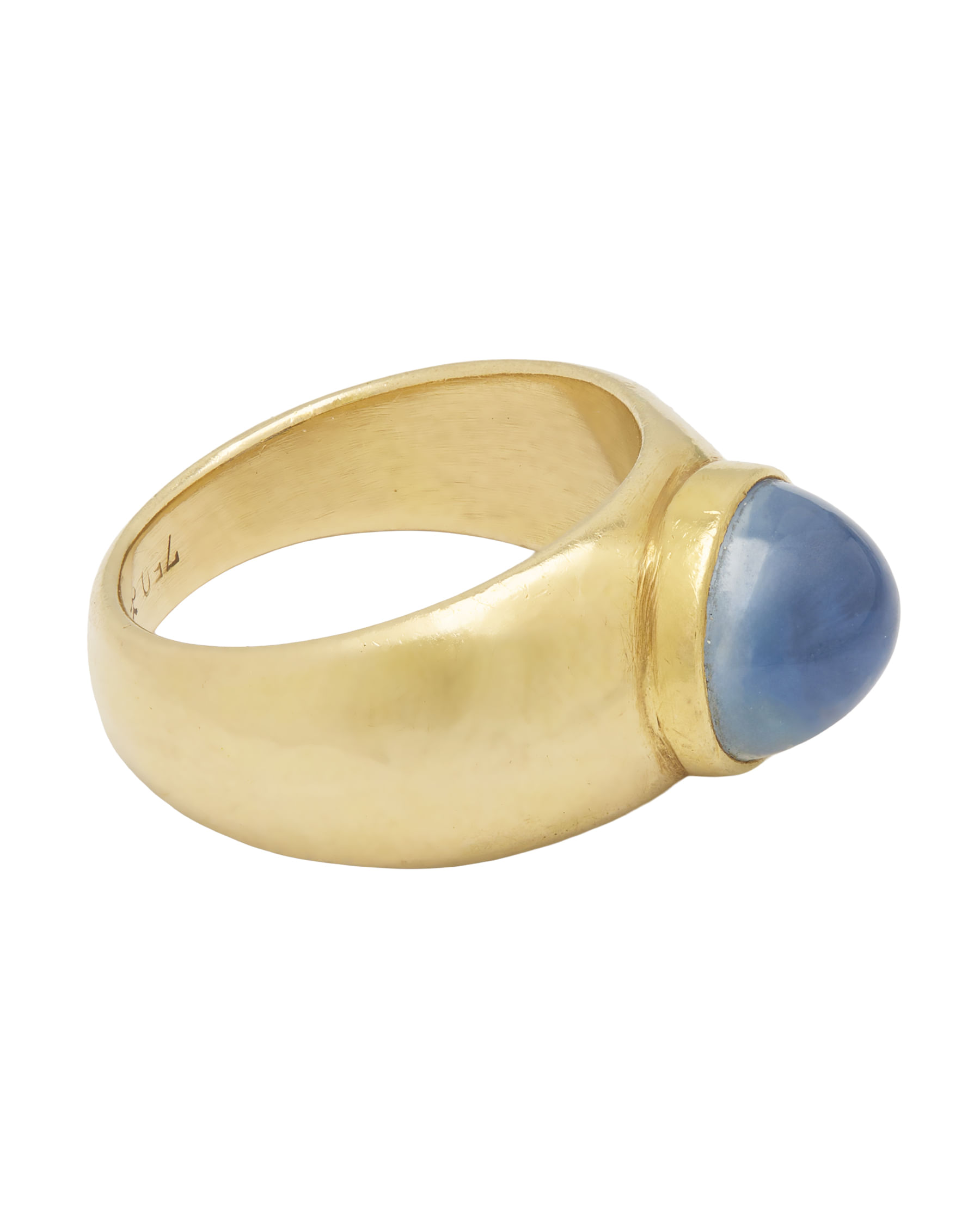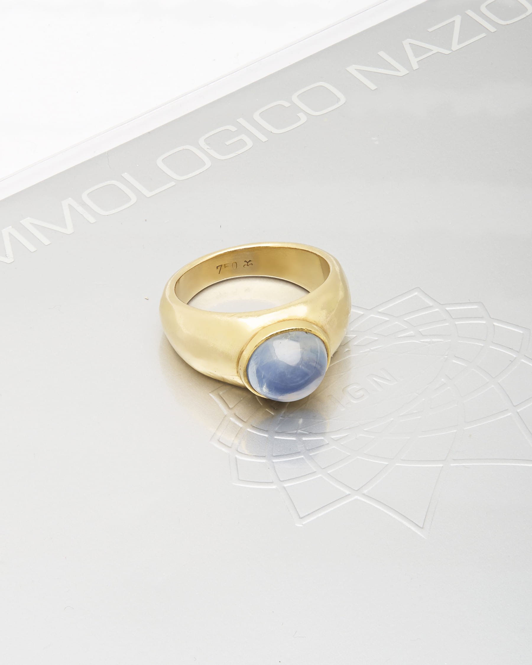 Scopri la brillantezza senza tempo dell’anello in oro giallo martellato 18 kt con uno spettacolare zaffiro cabochon 6 ct non scaldato. Un capolavoro rigenerato da indossare ogni giorno, completo di certificato gemmologico!