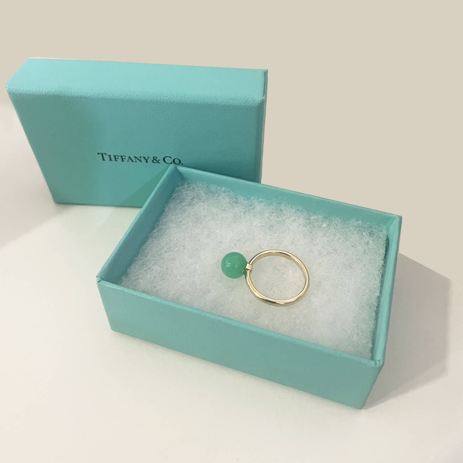 Anello Tiffany Ball realizzato in oro giallo 18kt e calcedonio verde. Misura 12. Con scatola originale. Diametro calcedonio 8mm