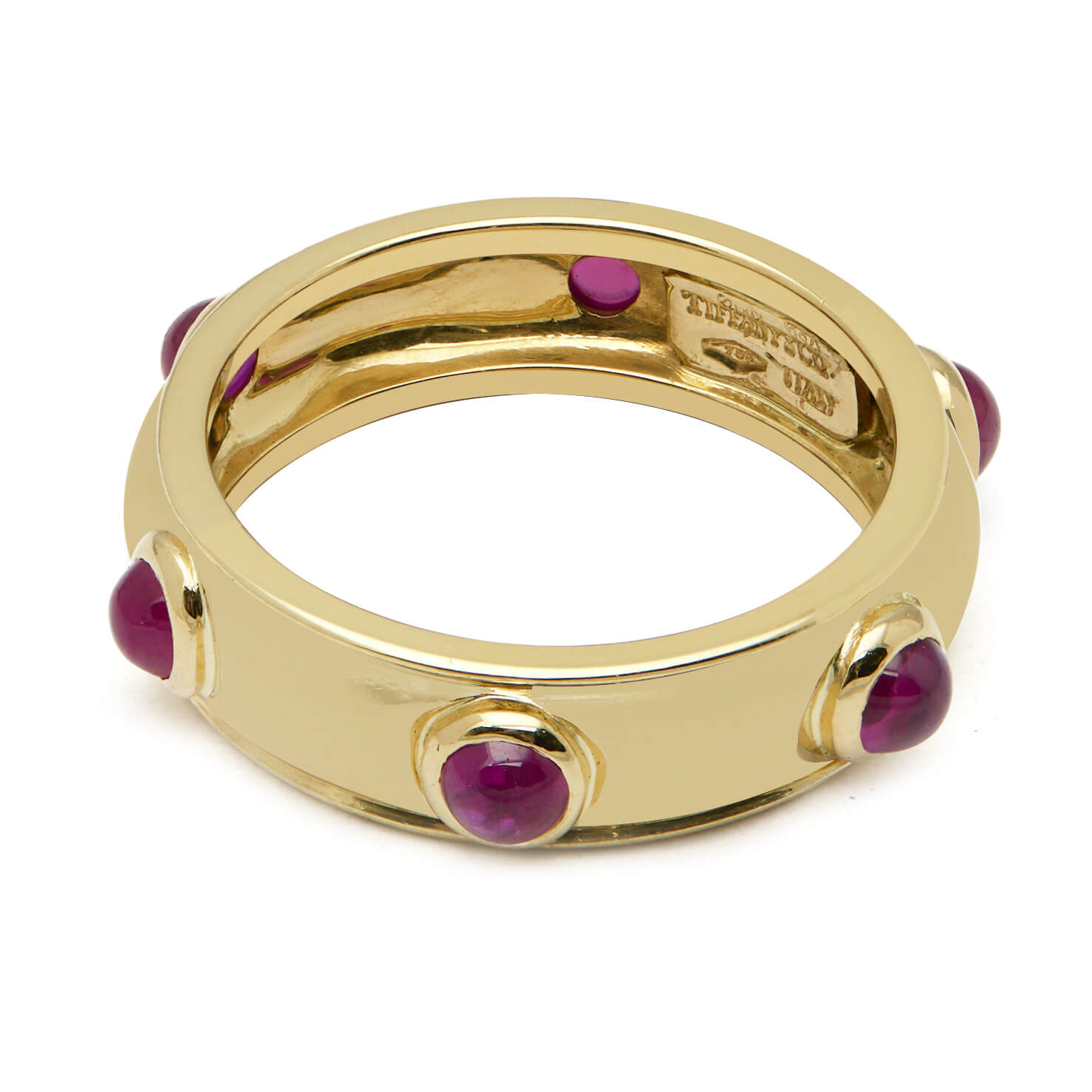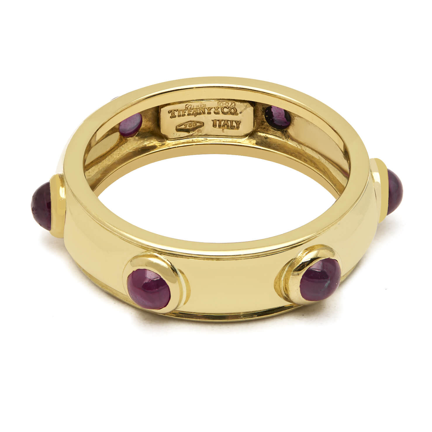 Anello Tiffany realizzato in oro giallo 18kt con rubini cabochon.Misura 9. Scatola Tiffany