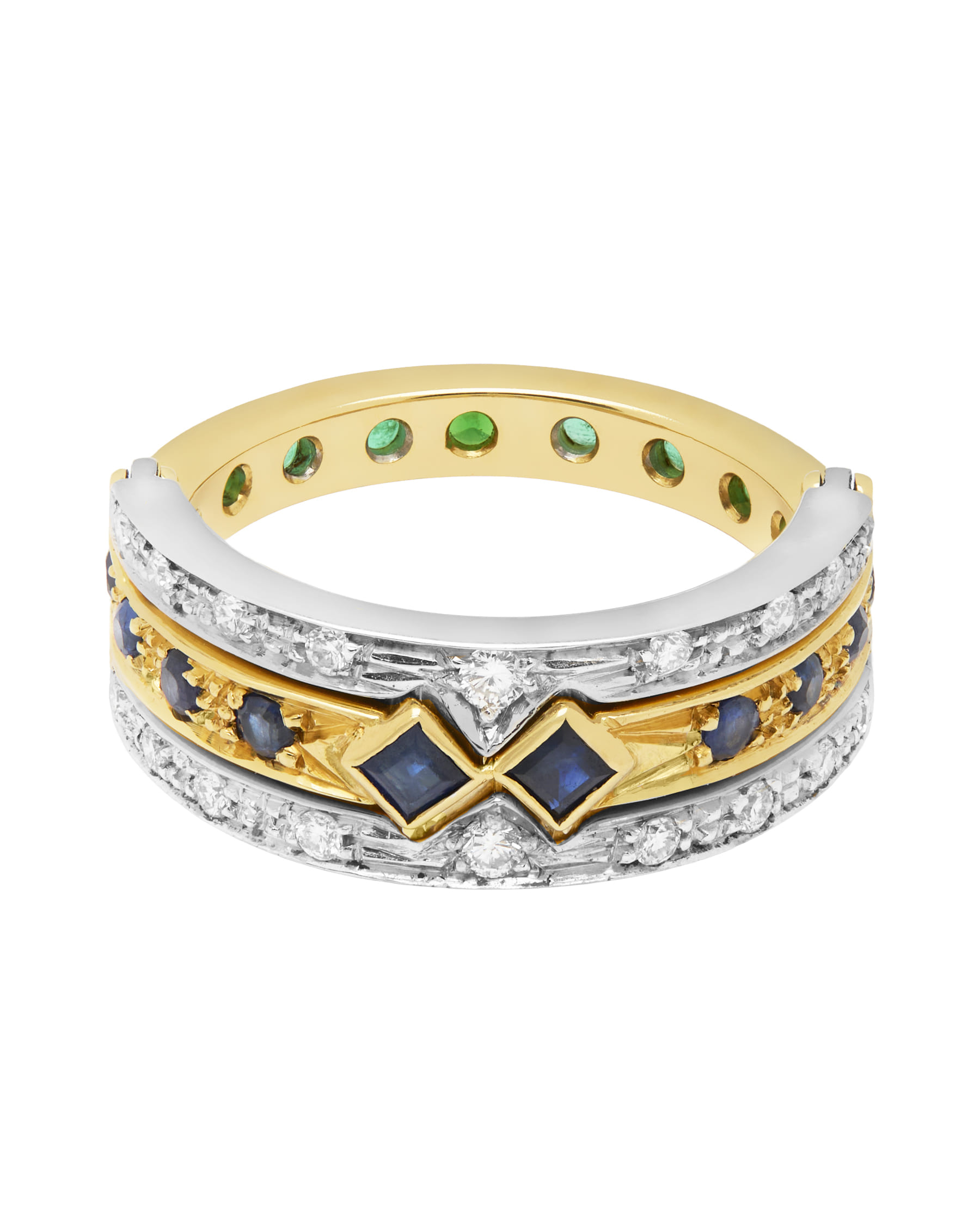 Anello trasformabile in oro bianco e giallo con diamanti, smeraldi e zaffiri