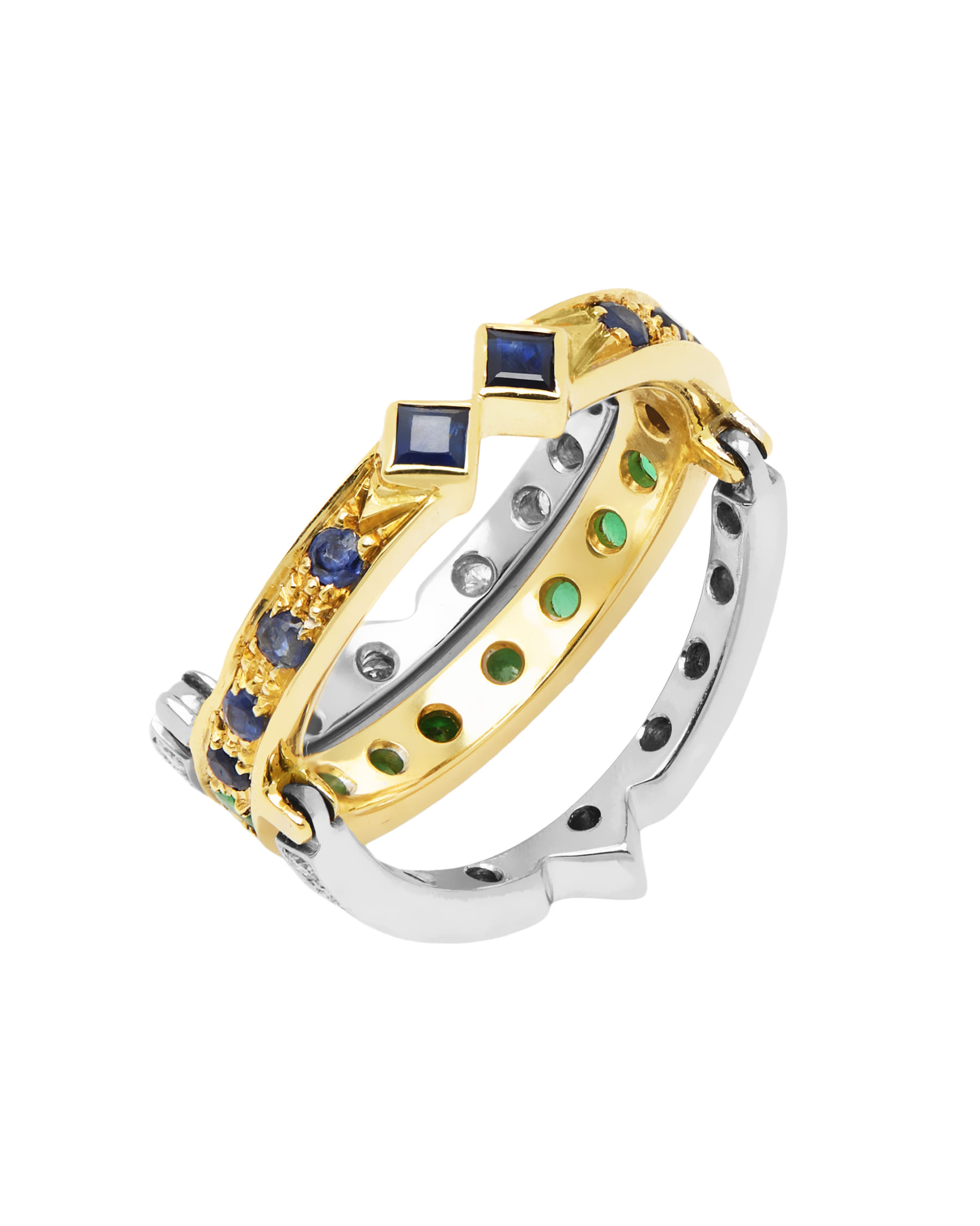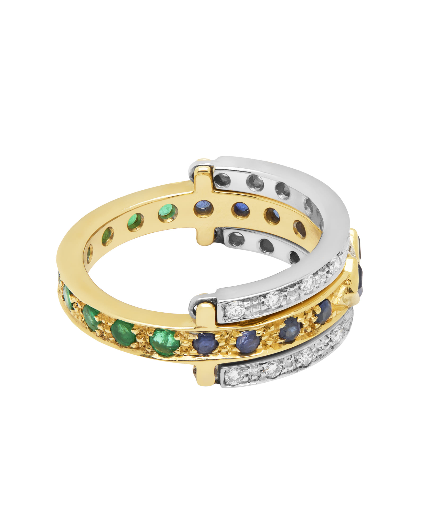 Rendi unico il tuo stile grazie all’anello trasformabile in oro bianco e giallo con diamanti, smeraldi e zaffiri. L’unione di materiali pregiati, pietre di alta caratura e dettagli artigianali trasforma ogni occasione in pura eleganza. Chiudi gli occhi e lasciati sedurre da un gioiello destinato a brillare per sempre!