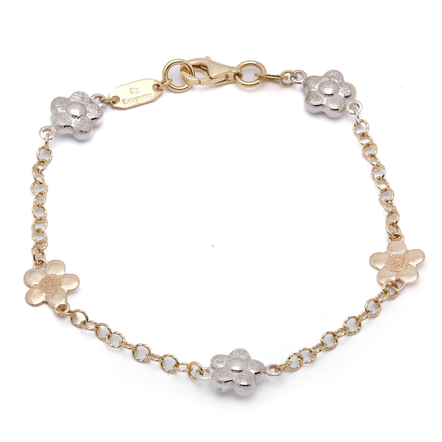 Bracciale in oro giallo con fiori in oro bianco e rosa