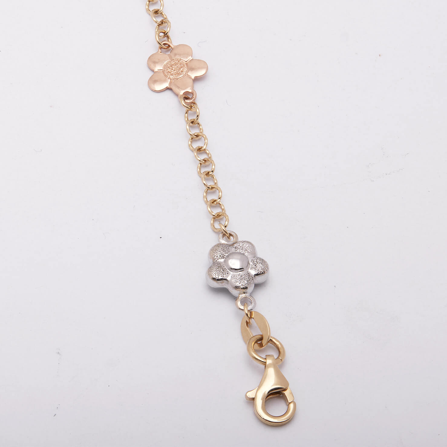 Bracciale realizzato in oro giallo 18kt con fiori in oro bianco e rosa 18kt. Lunghezza 17cm