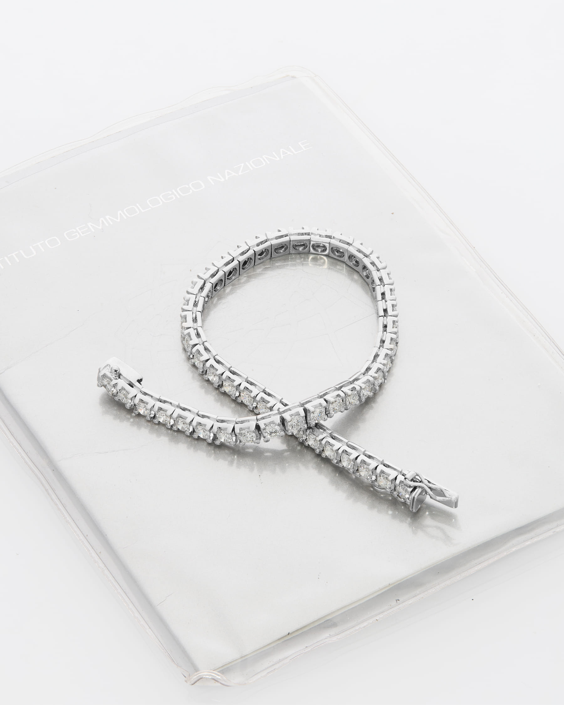 Un capolavoro di eleganza e luce! Lasciati incantare dal raffinato bracciale tennis in oro bianco 18kt con 48 diamanti taglio brillante dal peso totale di 3,80 ct, certificato e garantito: simbolo di puro lusso e stile senza tempo.