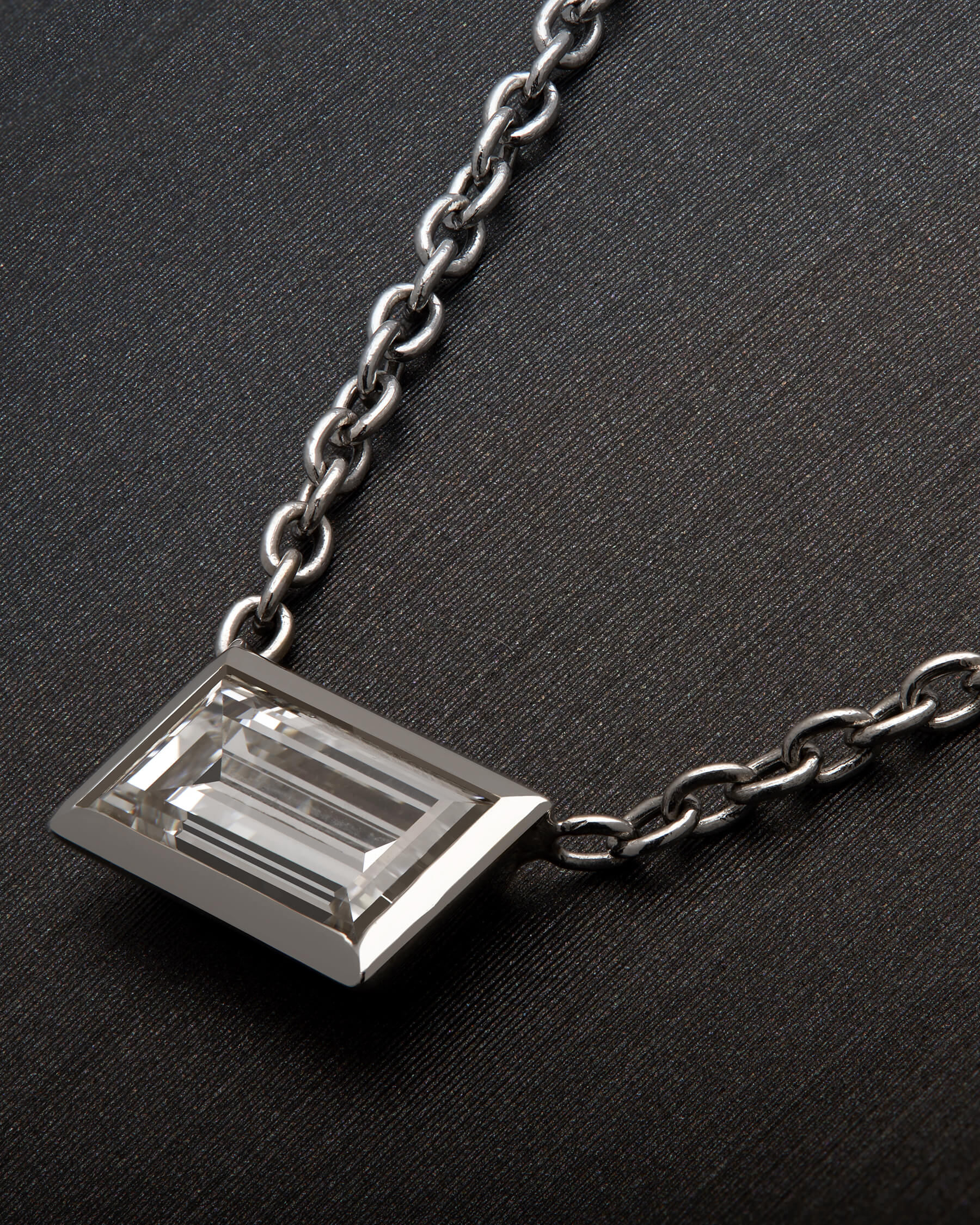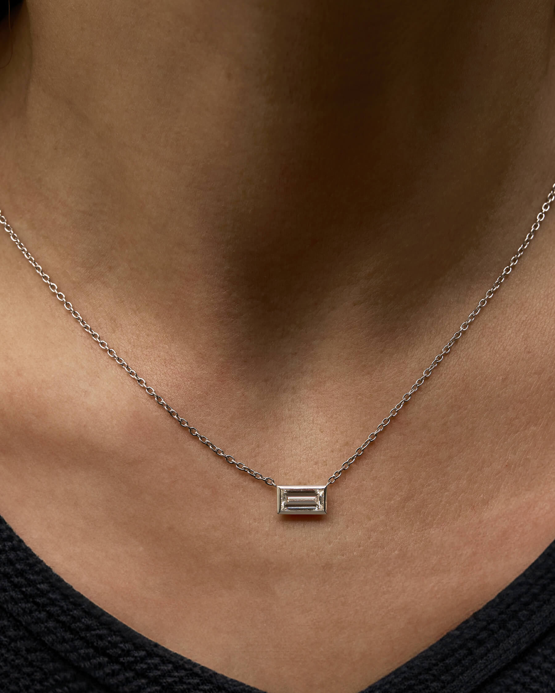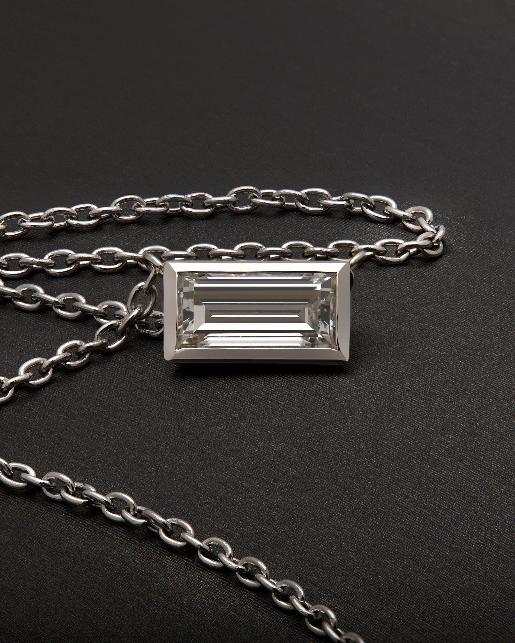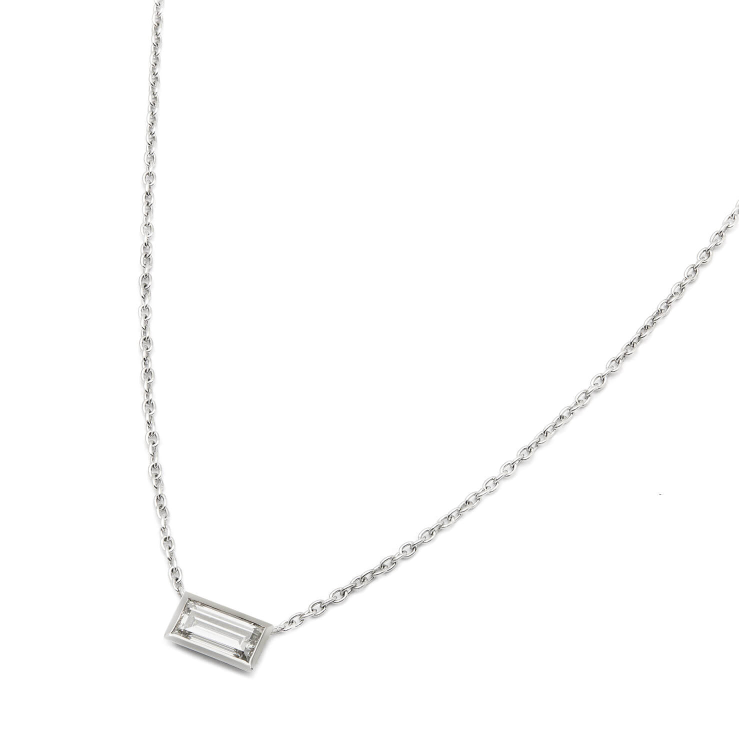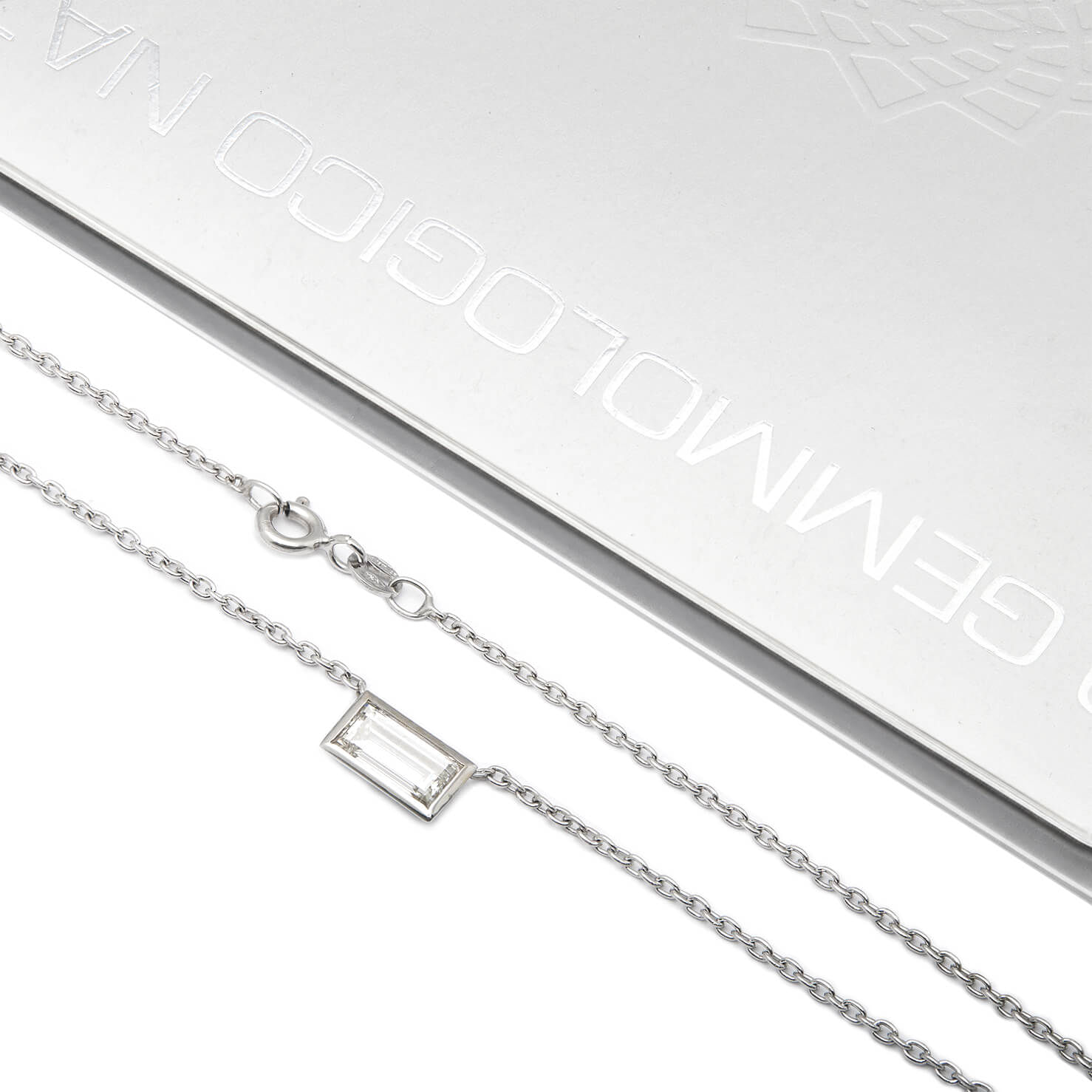 Catenina punto luce realizzata in oro bianco 18kt con diamante taglio rettangolare 0,95ct. Certificato IGN. L’articolo è una nuova creazione.Lunghezza 42,5cm
