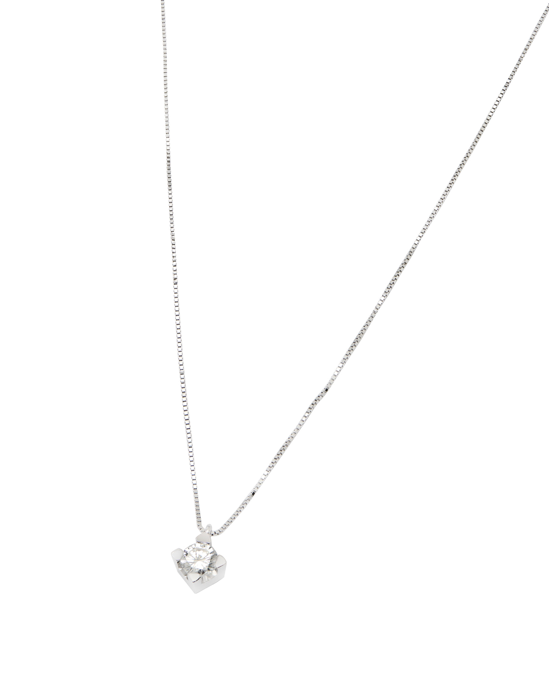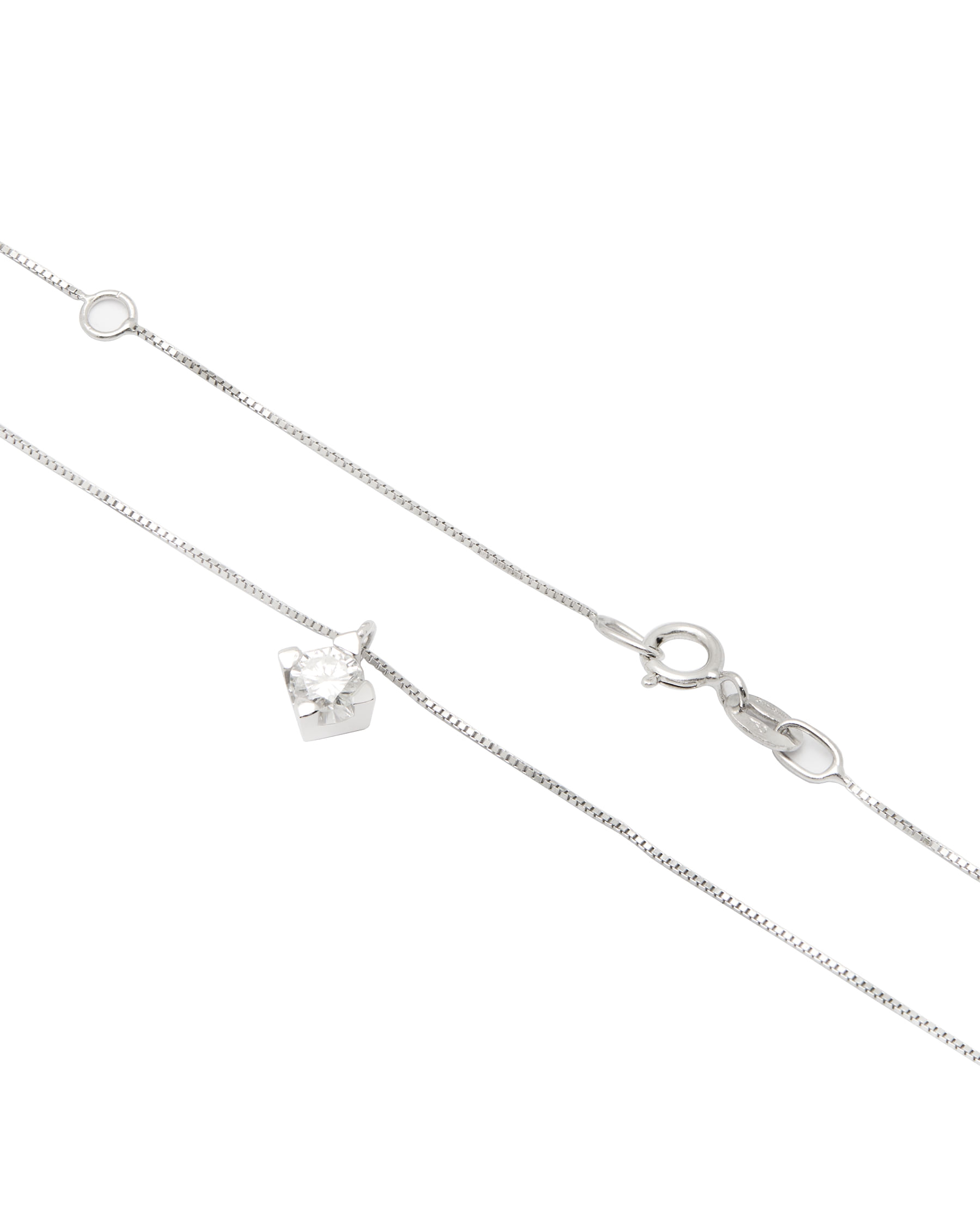 Catenina punto luce tornita a rombo realizzata in oro bianco 18kt e diamante taglio round 0,21ct. Lunghezza da 42,5 a 45,5 cm. L’articolo è una nuova creazione