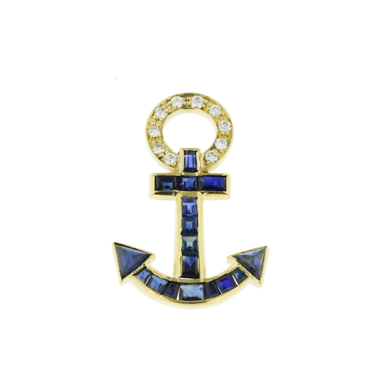 Ciondolo 2 Ancora in oro giallo con diamanti 0,10ct e zaffiri 1,40ct