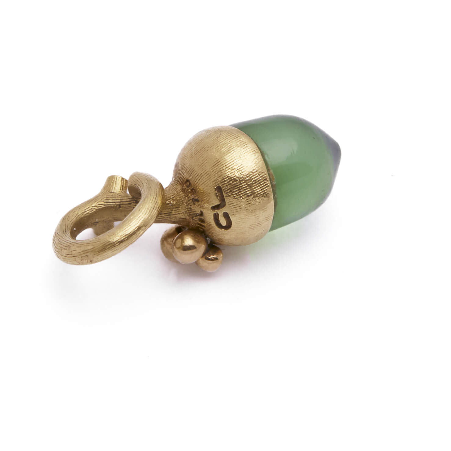 Ciondolo Ghianda realizzato in oro giallo satinato 18kt con pietra verde e diamante 0,005ct. Misure 1,5×0,5cm