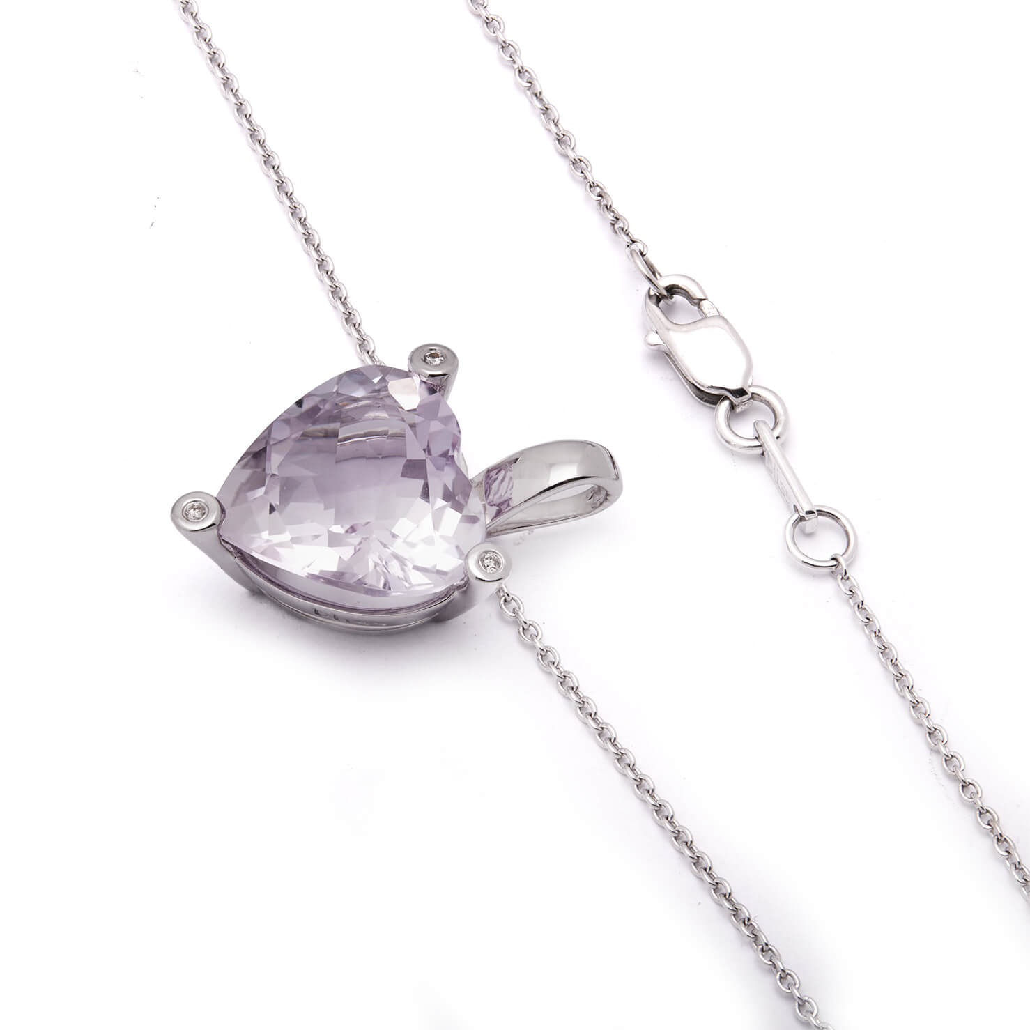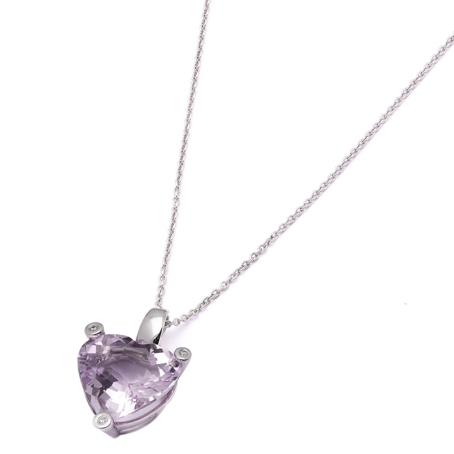 Collana Bliss con ciondolo cuore realizzata in oro bianco 18kt con ametista 4,26ct e diamanti round 0,015ct. Lunghezza 46cm. Ciondolo cuore 2cm