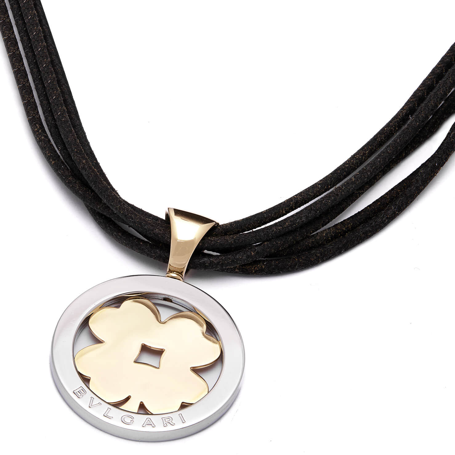 Collana Bulgari con ciondolo quadrifoglio in acciaio e oro