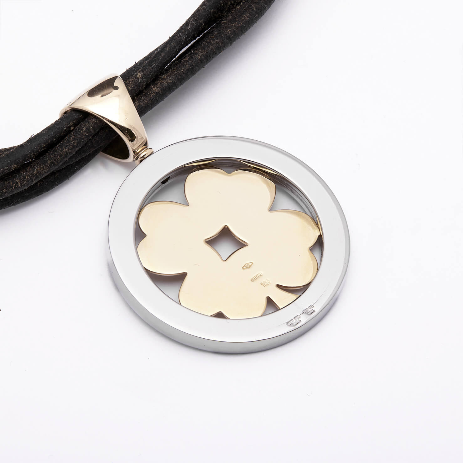 Collana Bulgari con ciondolo quadrifoglio realizzata in acciaio e oro giallo 18kt. Lunghezza 42c. Ciondolo 4,5x3cm