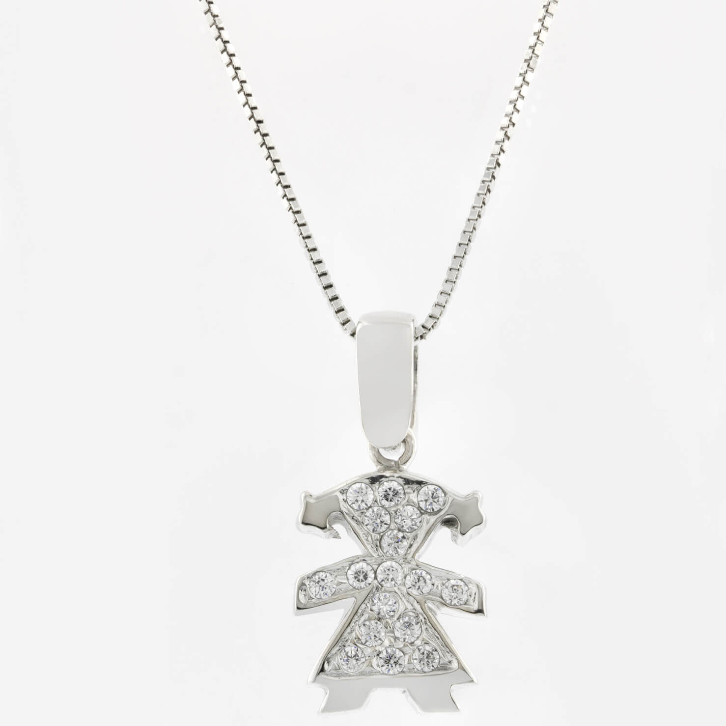 Collana con ciondolo bimba realizzato in oro bianco 18kt e zirconi. Lunghezza 45cm