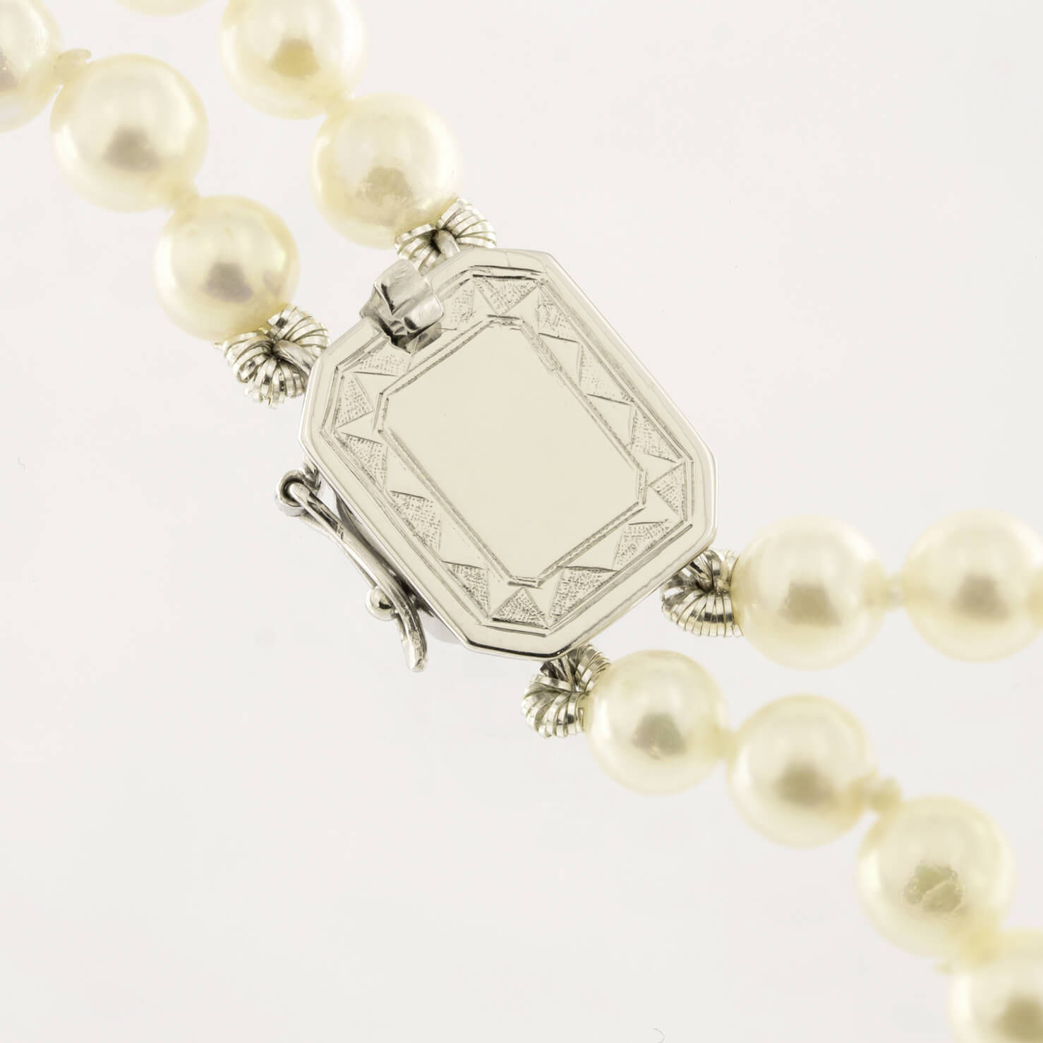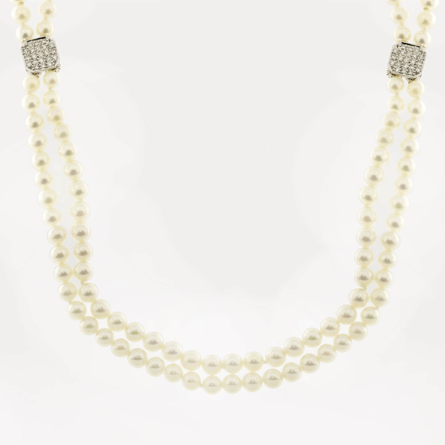 Collana realizzata in oro bianco 18kt con perle naturali da 5mm e diamanti taglio round 0,50ct tot.