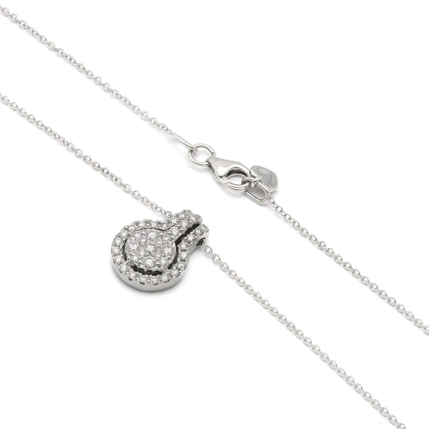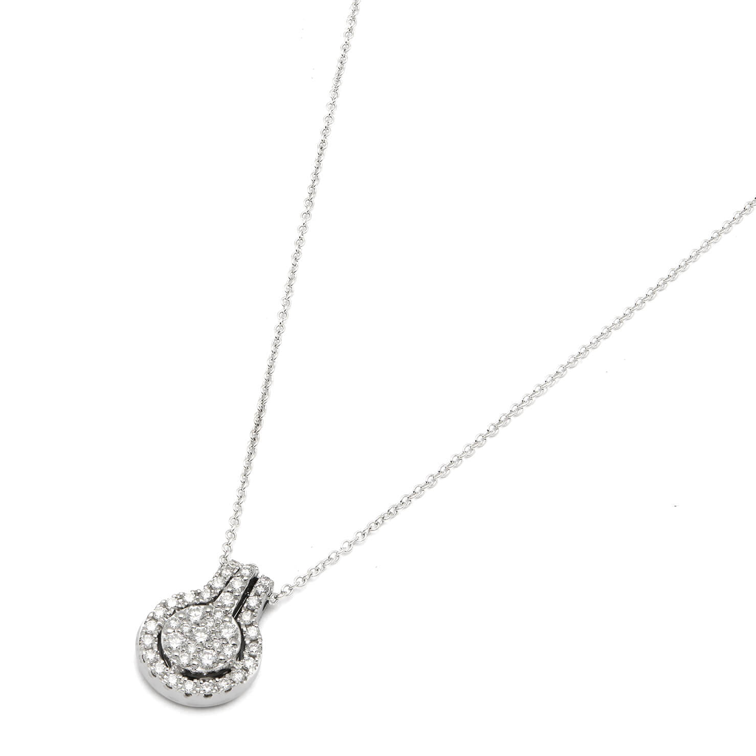 Collana realizzata in oro bianco 18kt con ciondolo pavé di diamanti round 0,43ct tot. Lunghezza regolabile da 40 a 45cm. Ciondolo 1,3x1cm
