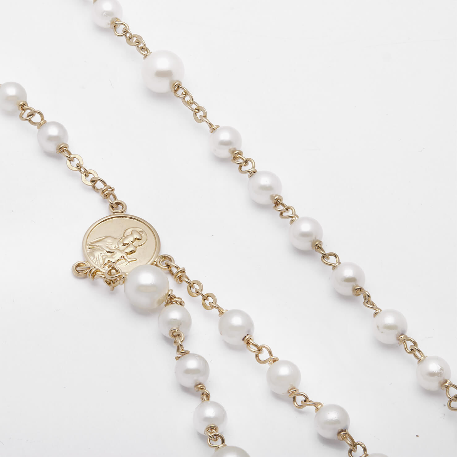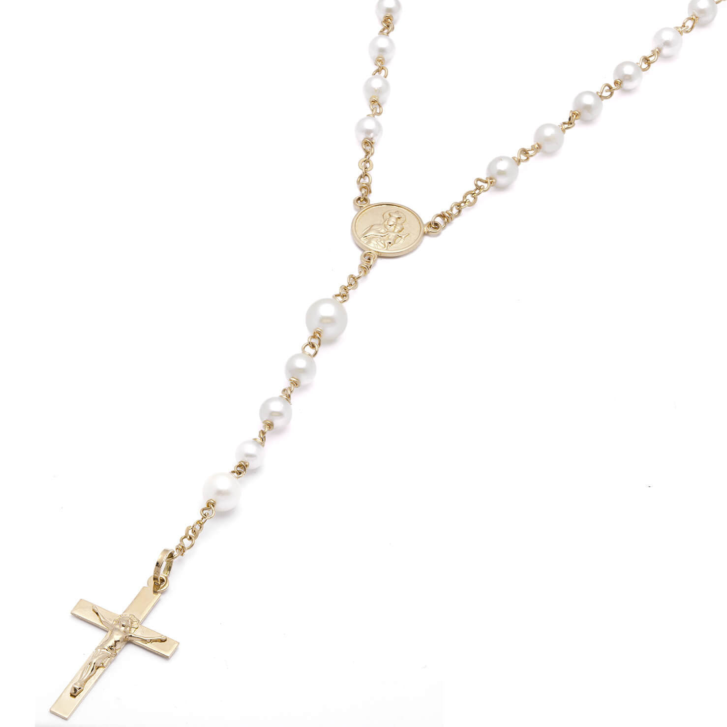 Collana rosario realizzata in oro giallo 18kt e perle 4,8mm l’una. Lunghezza totale 91cm. Ciondolo 3,5x2cm