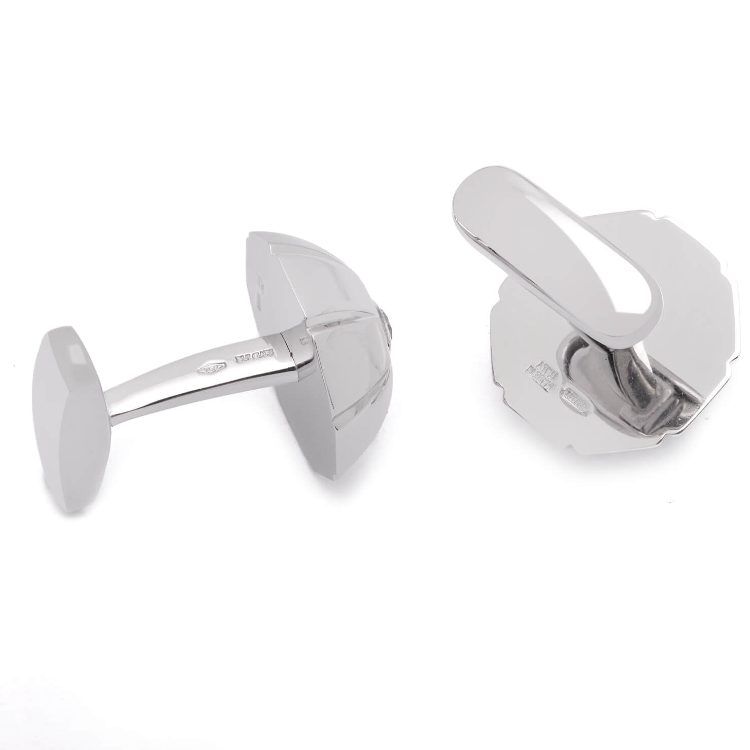 Gemelli Bulgari realizzati in oro bianco 18kt e diamanti 0,20ct tot. Misure 2×1,5cm. Scatola Bulgari