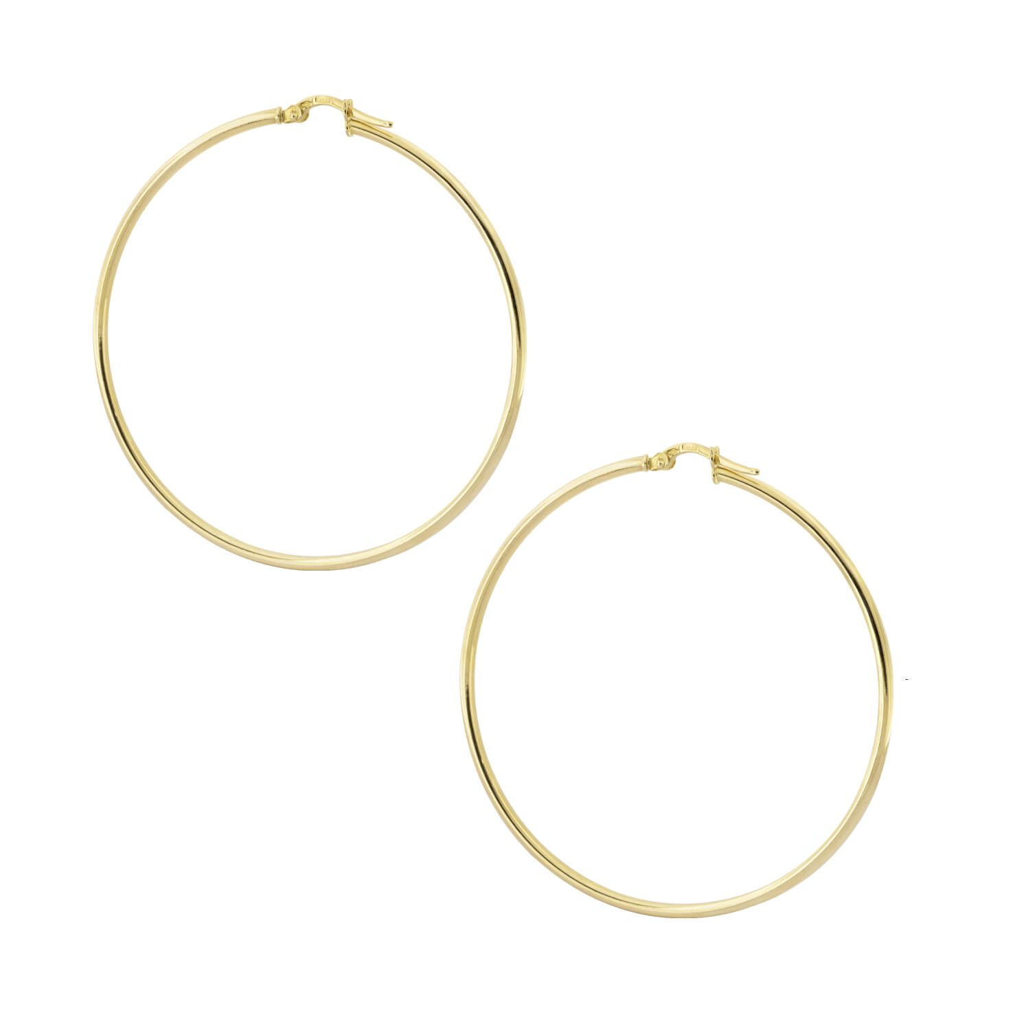 Orecchini a cerchio realizzati in oro giallo 18kt. Diametro 5,30cm. L’articolo è una nuova creazione