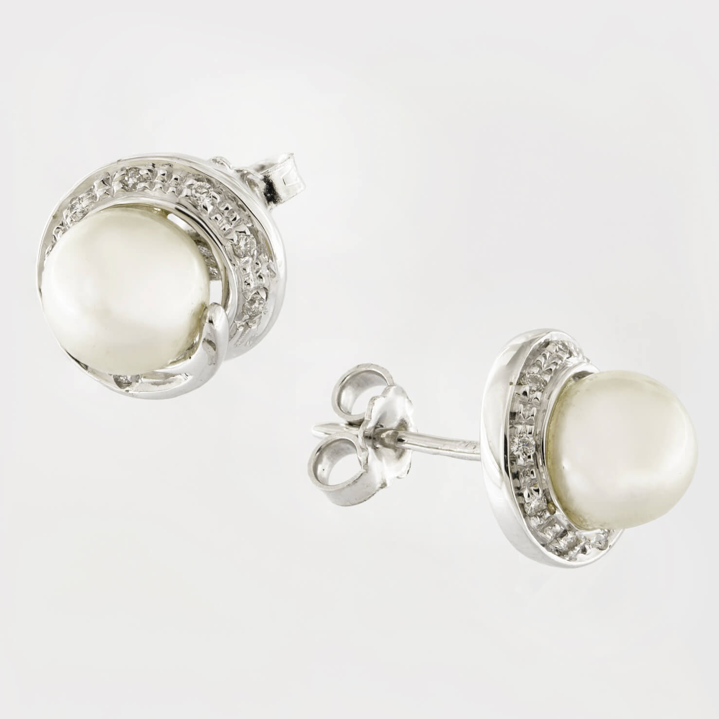Orecchini in oro bianco con perle 7,30mm e diamanti round 0,06ct tot