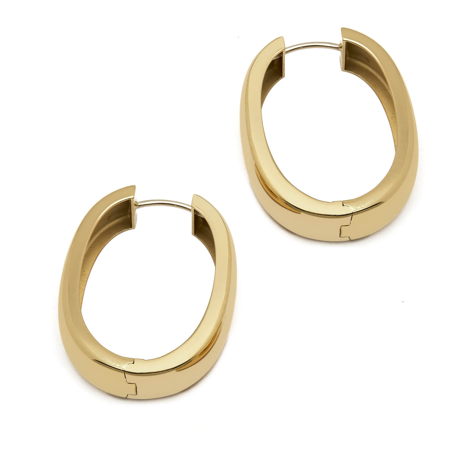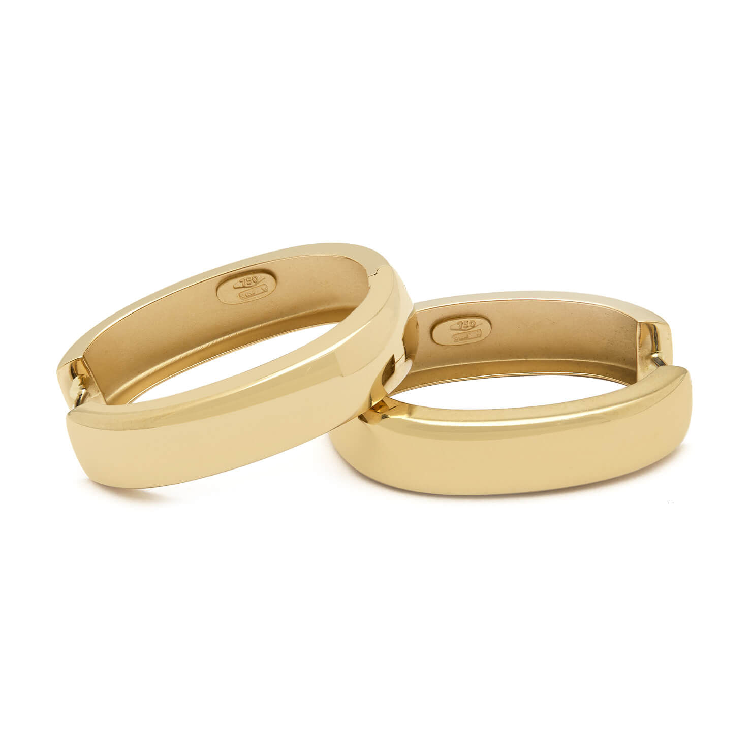 Orecchini realizzati in oro giallo 18kt a cerchio ovale. Misura 3,5×2,5cm. Spessore 8mm