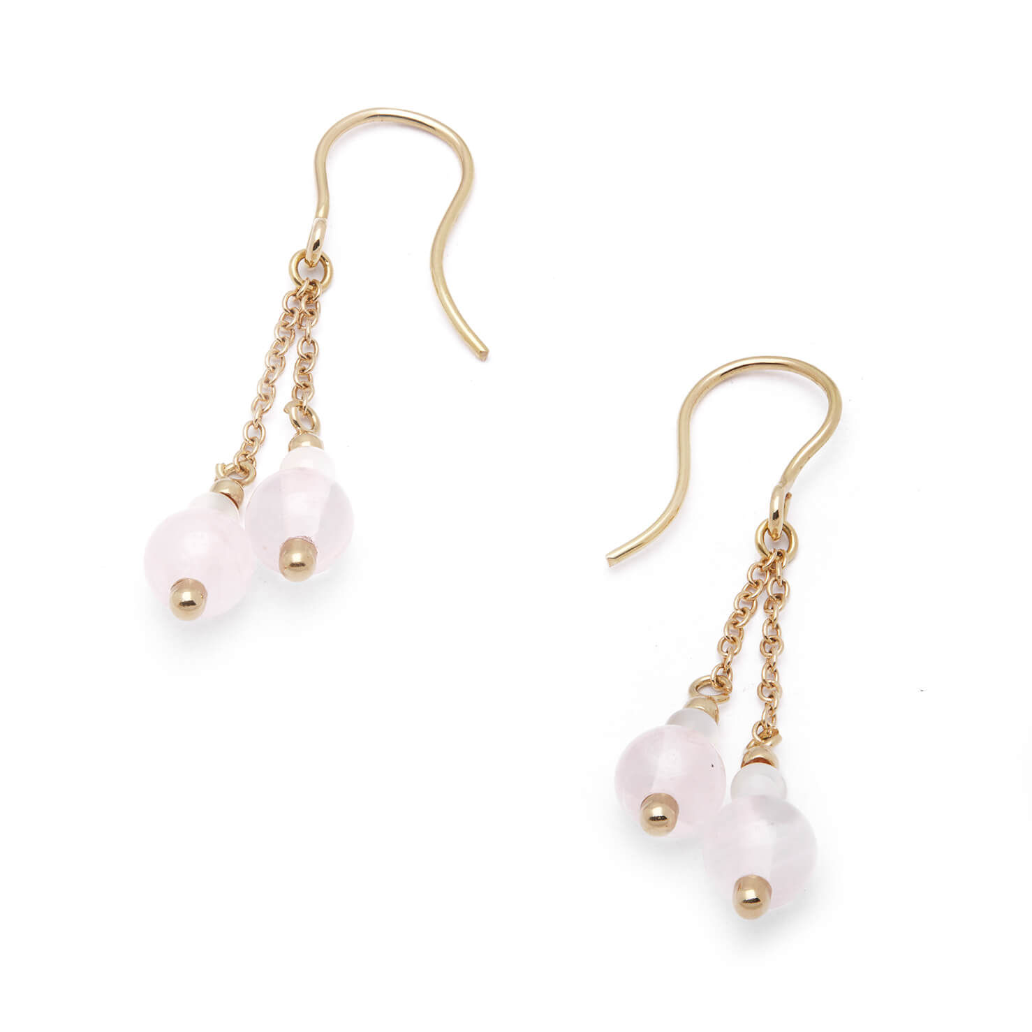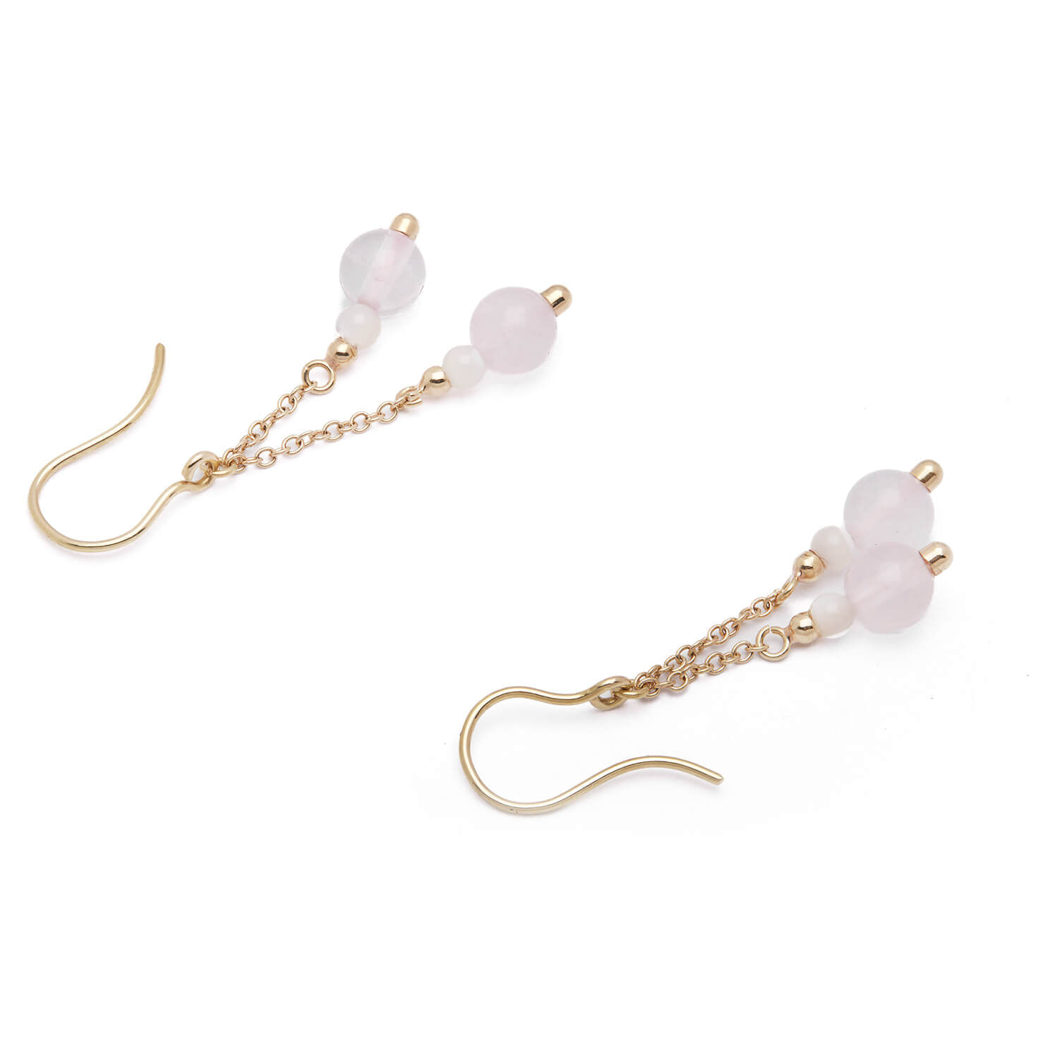 Orecchini realizzati in oro giallo 18kt con quarzo rosa e bianco. Lunghezza 4cm