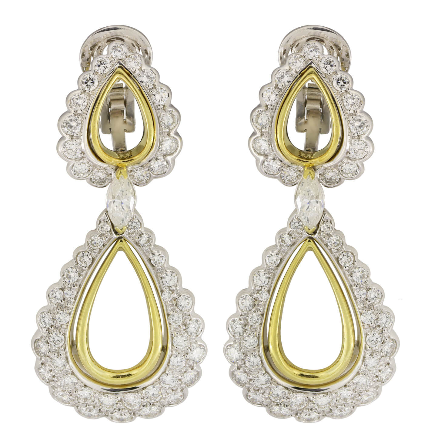 Orecchini pendenti realizzati in oro bianco e giallo 18kt con diamanti taglio round e marquise 4,28ct tot