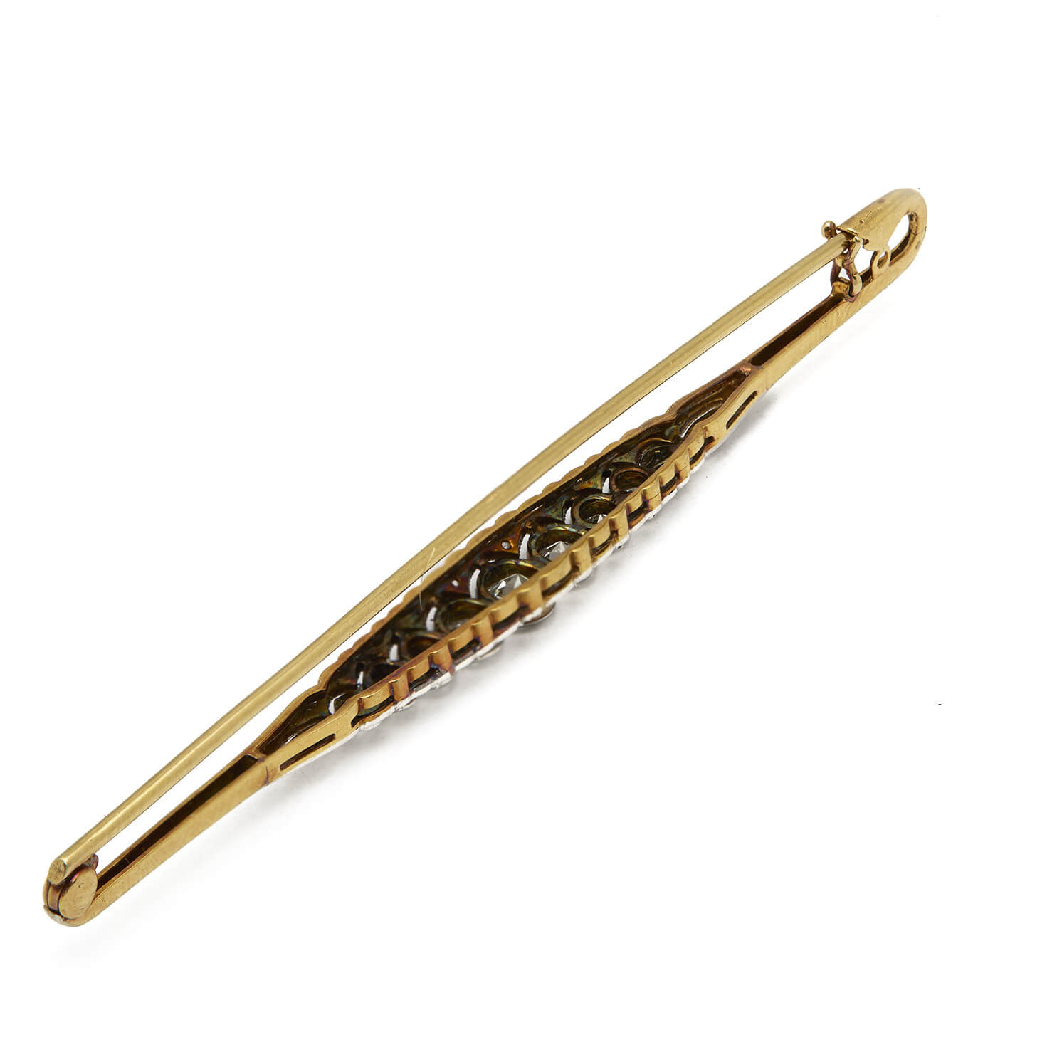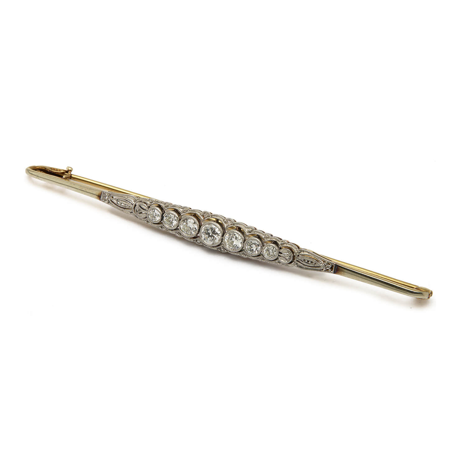 Spilla realizzata in oro giallo e bianco 18kt con diamanti 0,62ct tot. Misure 7×0,40cm