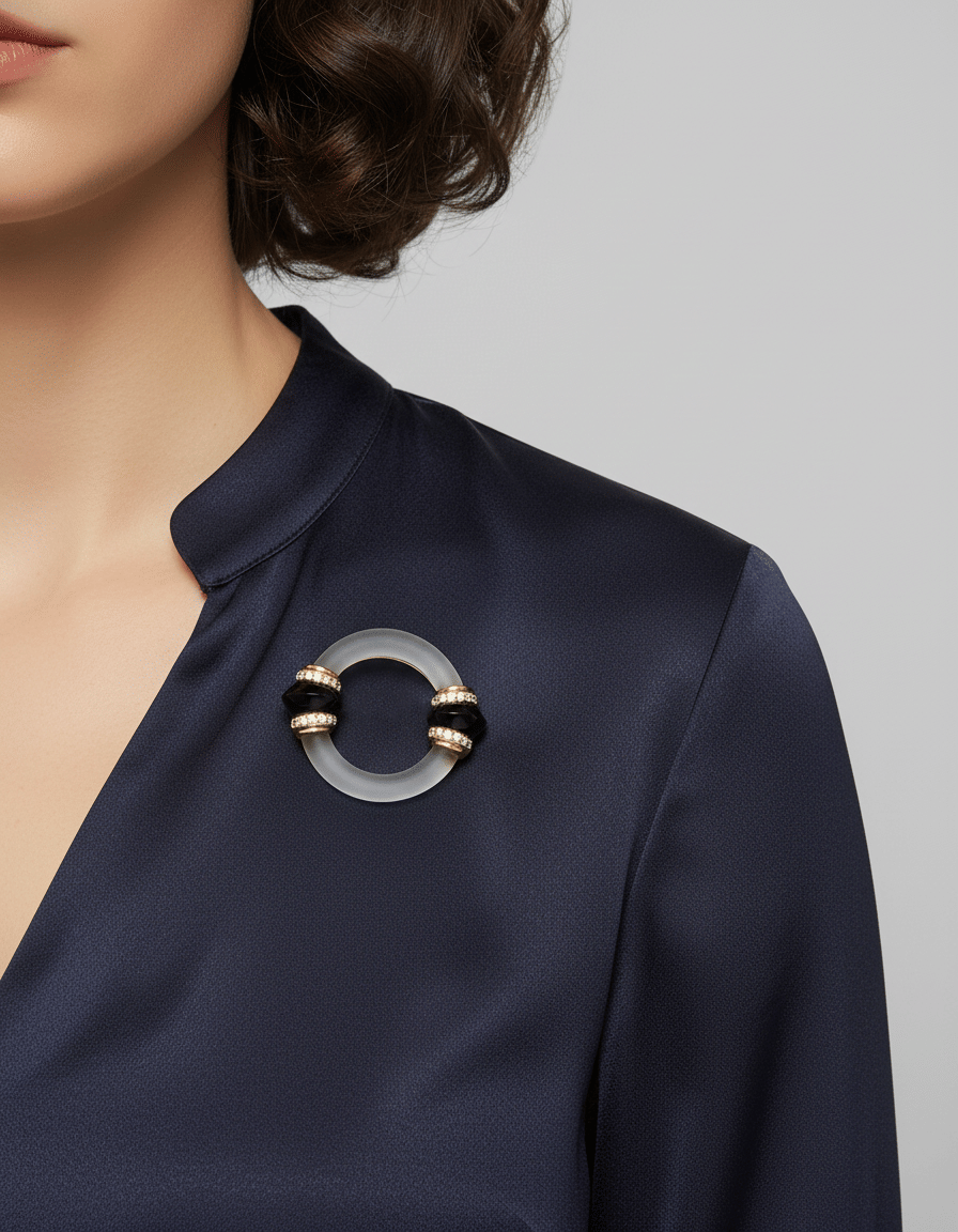Questa spilla art déco in oro giallo, diamanti, onice e cristallo di rocca non è solo un gioiello, è l’espressione di un gusto raffinato e indimenticabile. Brilla con personalità, classe e dettagli preziosi che conquistano al primo sguardo!